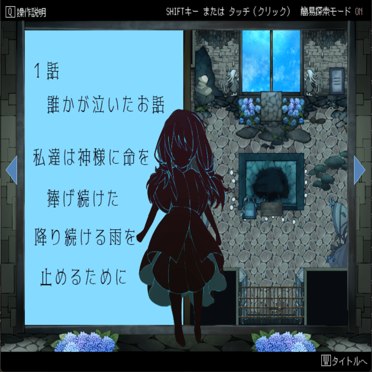 このゲームは基本的には章立てされた「探索型アドベンチャーゲーム」で、徐々に変化していく探索箇所を読み進めながら、「進展していくストーリーを楽しむゲーム」になります。