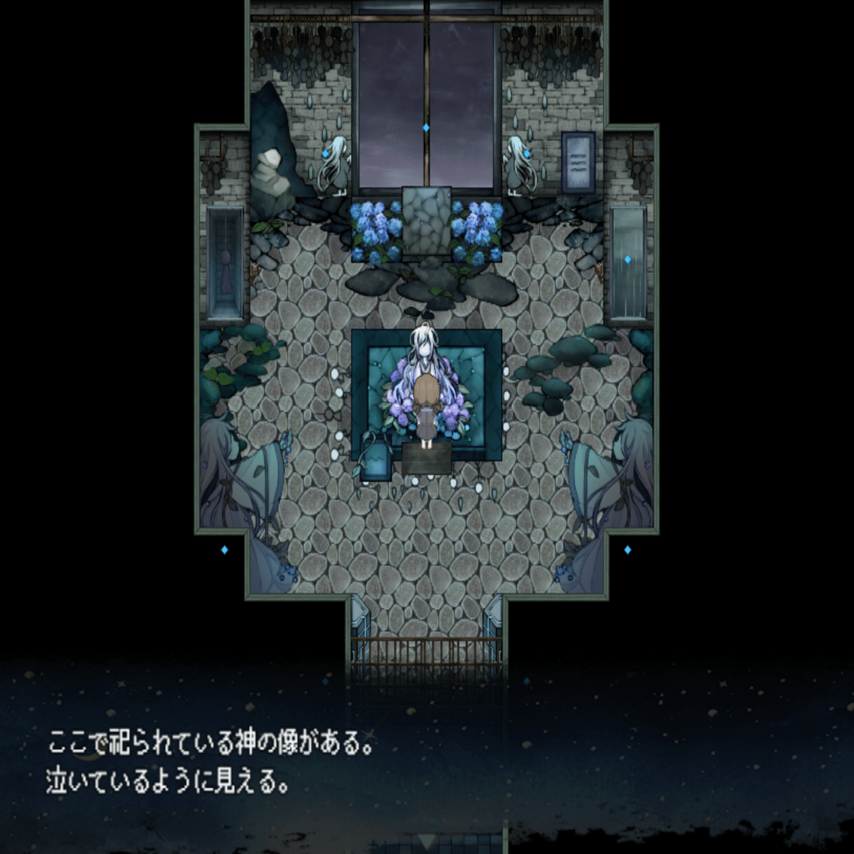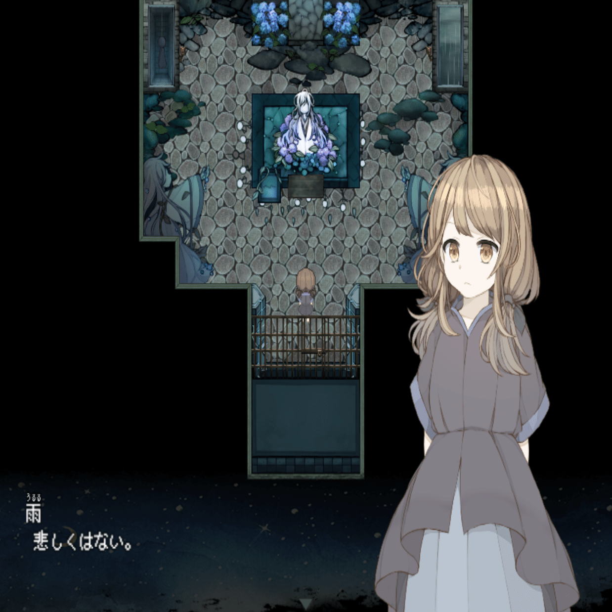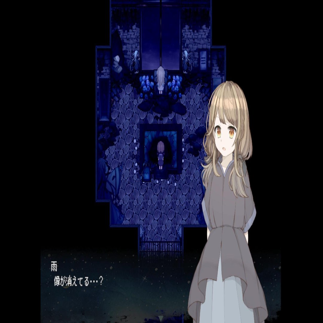さて、雨(うるる)が探索を一通り終えてひと眠りすると、遺跡の雰囲気が変化します。具体的には中央の像が消えて、奥に一人の少女が出現します。