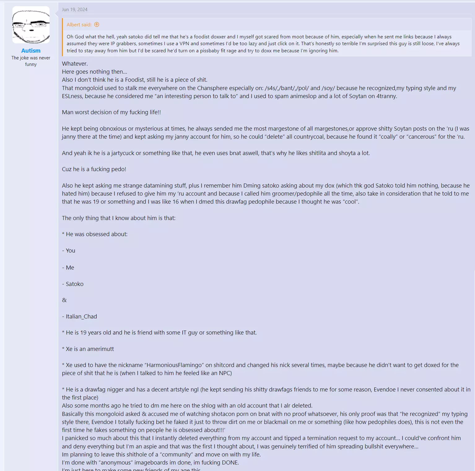 Wasn't Albert an Albanian who used to fight with Satoko and Italian Chad back in 2023 and 2024? I remember him requesting his booru account to get banned.Remember the first Iraqi immigrant named Albert.