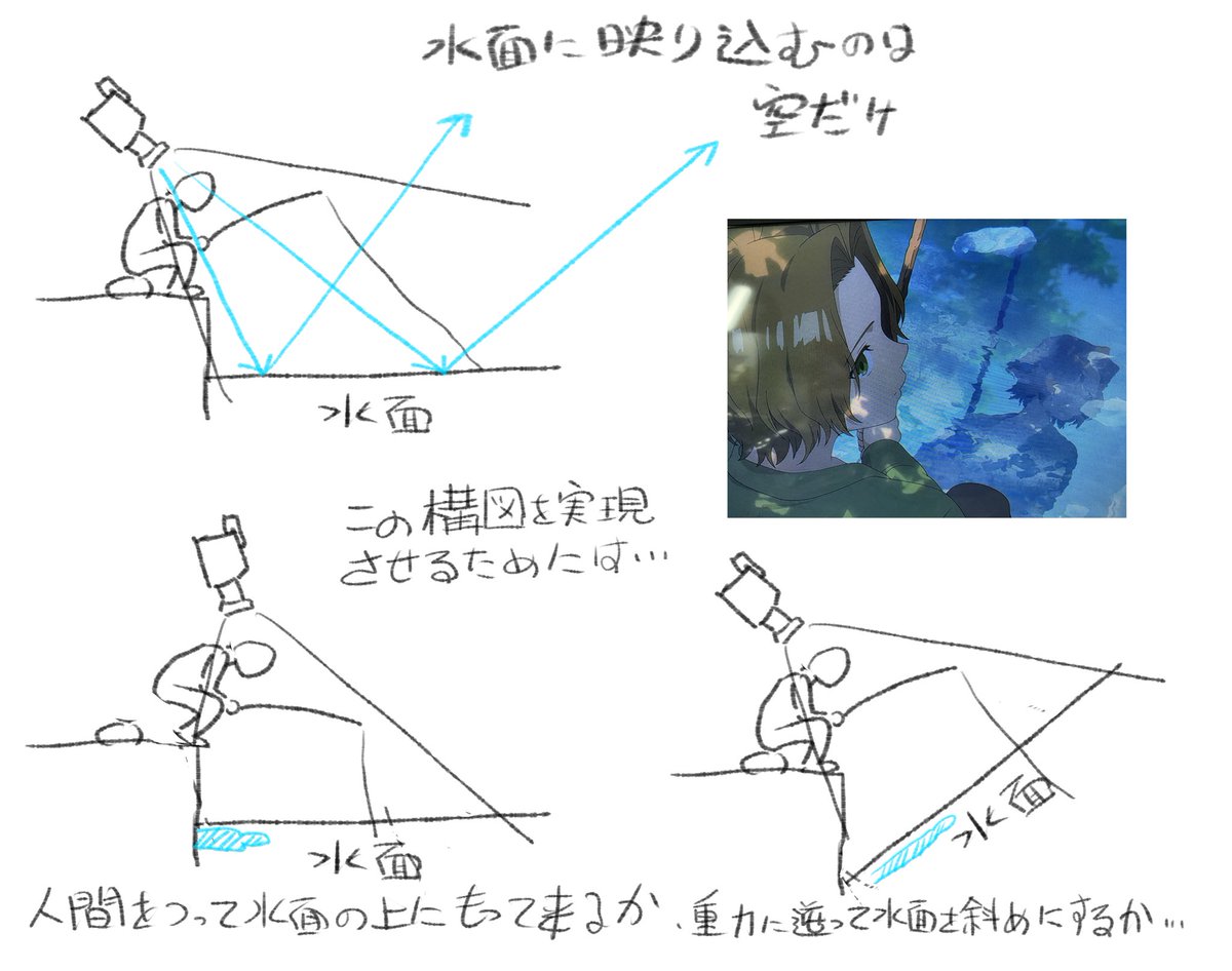 今たまたまフリーレンの16話を見てたんだが、こんな構図のカットを見たんで思うところを書いてみる。 「その人を舐めて水面に映り込む本人を描く」 これ、光学的には不可能な(つまり実写では撮れない)構図なんだよね。 それを分かっててあえてやってるのか?それとも知らずにやってるのか? pic.twitter.com/ItlYO4pzm5