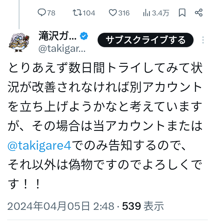 滝沢ガレソの凍結(表示規制)はVPN仕様に端を発した技術的な問題が原因ですぐに修正されるはず。 そもそもイーロンマスクはインプゾンビで増えたトラフィックを見て純粋に喜ぶような人間なので訴訟されようがゴシップで稼ごうが“数字”を出せるなら大歓迎。 おめでとう、明日には釈放だ pic.twitter.com/2mDOTK8G8b