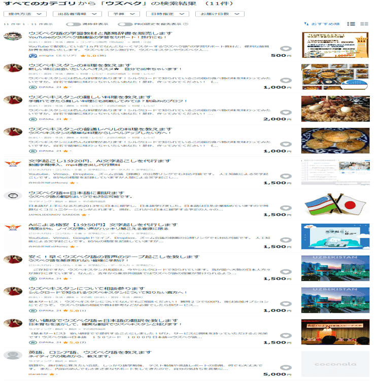 ただ、やはり一般的に「ココナラ」で「ウズベク語」にたどり着く発想になる想像がつきません(笑)
