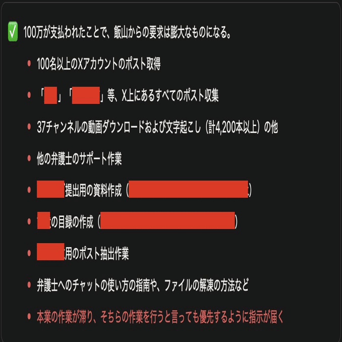 「波夷羅太郎」氏が「飯山からの要求は膨大なものになる」と記しておりますが、飯山陽さんからの要求内容はその抱えている訴訟に関しての当然の要求かと思います。裁判で必要な資料をそろえるために必要な資料作成を依頼したにすぎないです。