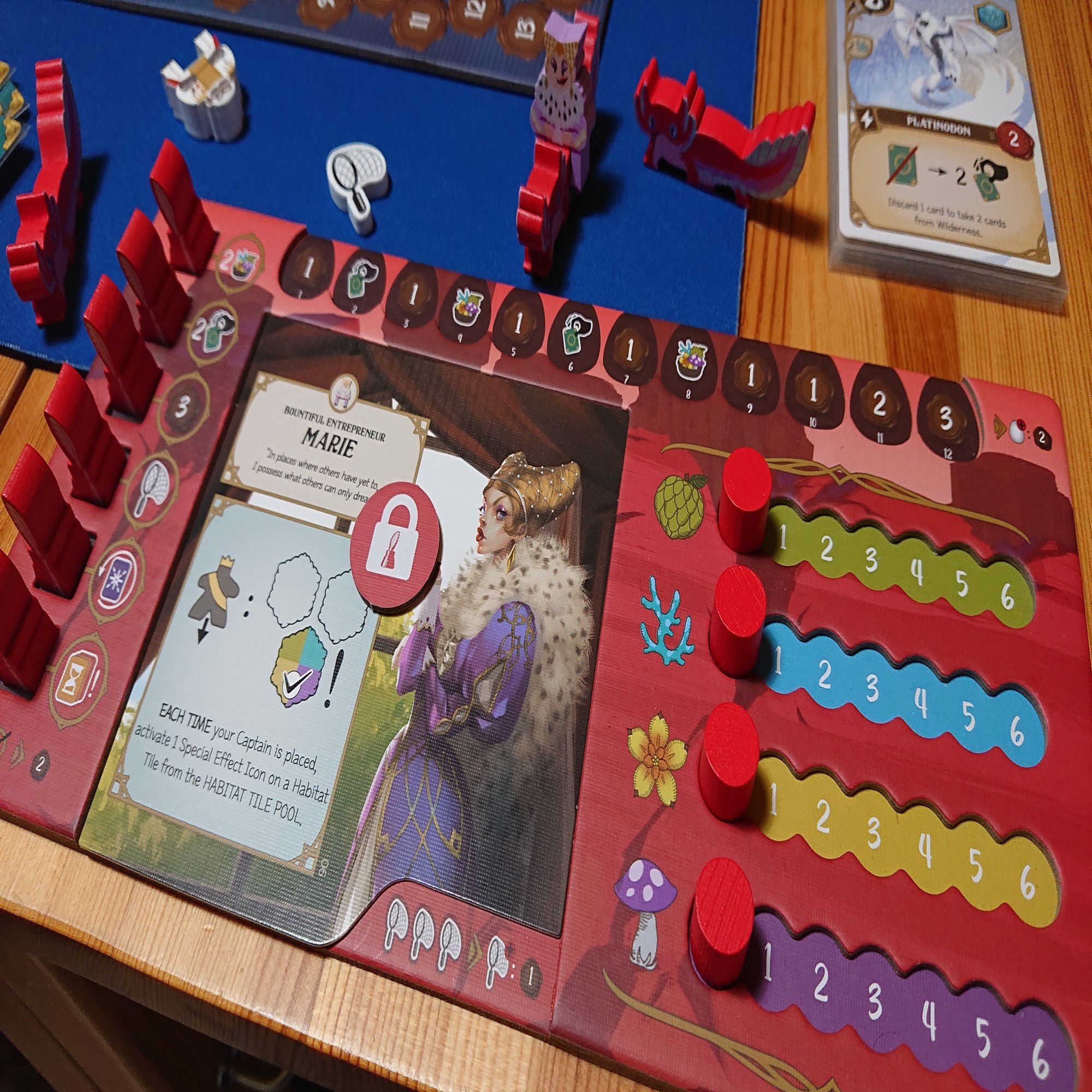 各プレイヤー、最初にトロフィーを受け取ったタイミングで個人ボードのロックトークンが取り除かれ、キャラクターカードの特殊能力が開放されます。これにより、キャラクターコマが跨がっているワーカーは配置時に特殊能力が発動するようになります。