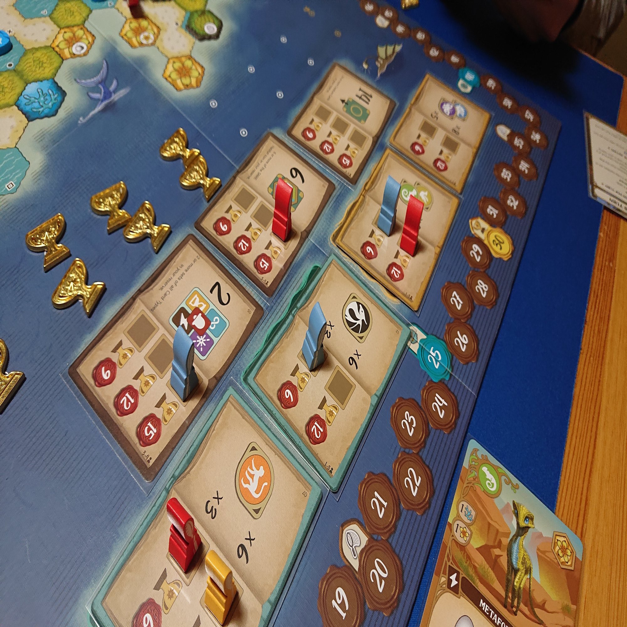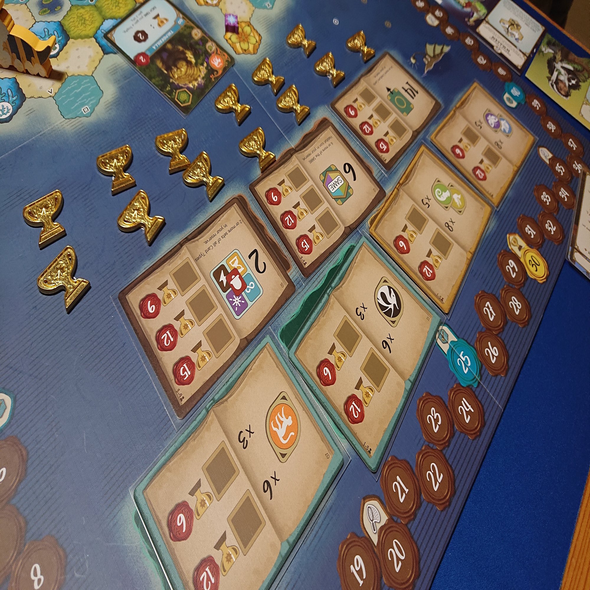 最後に共通目標やプレイしたカードやトロフィーの勝利点などを、ゲーム中に獲得した勝利点に加えます。最も得点の高いプレイヤーの勝ち。