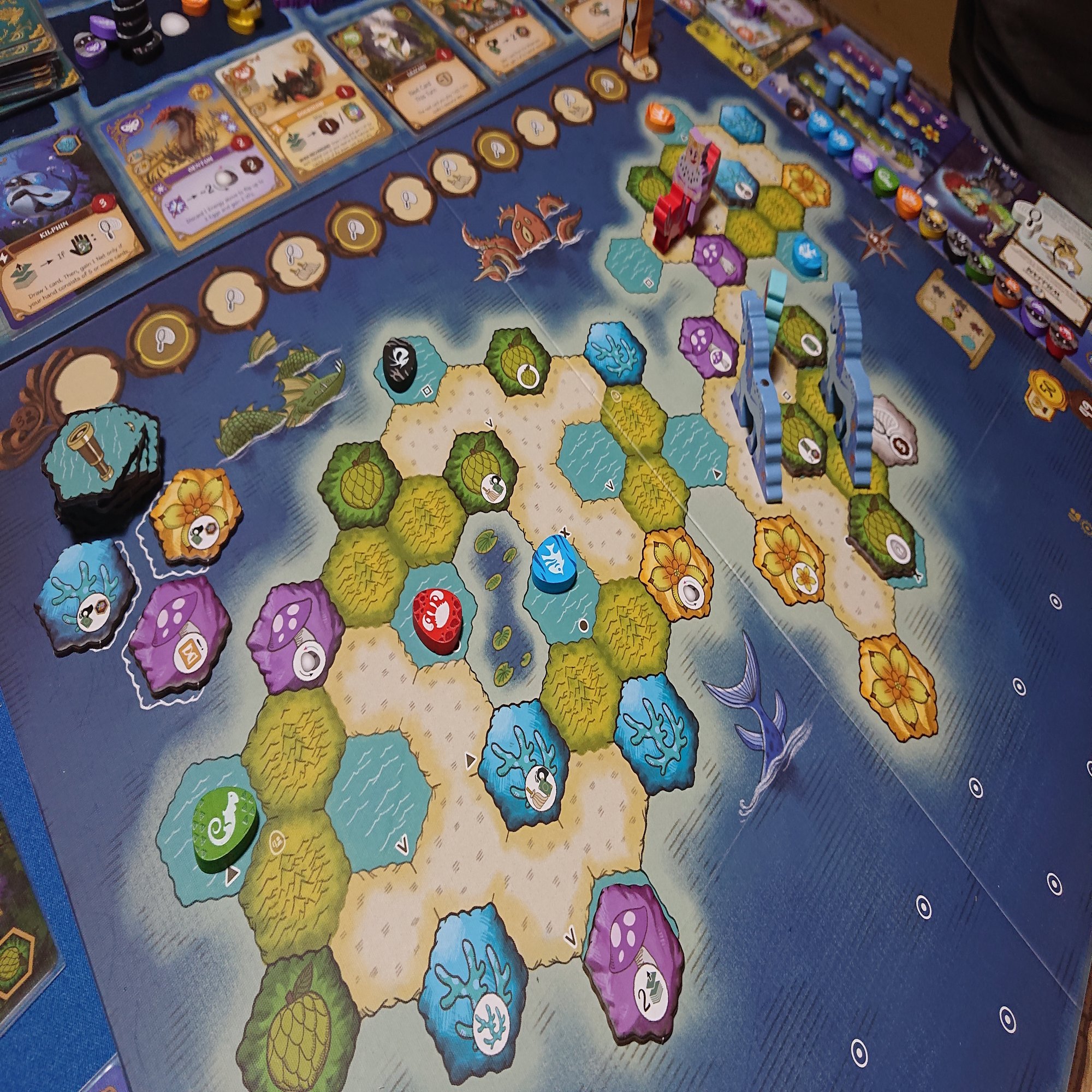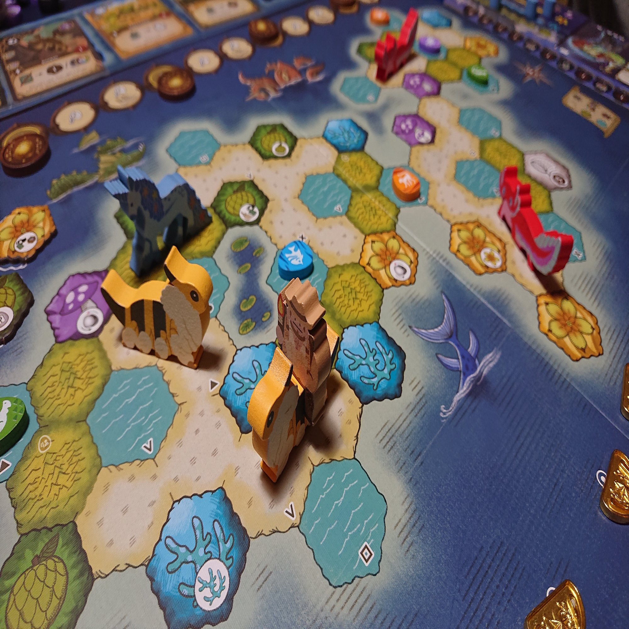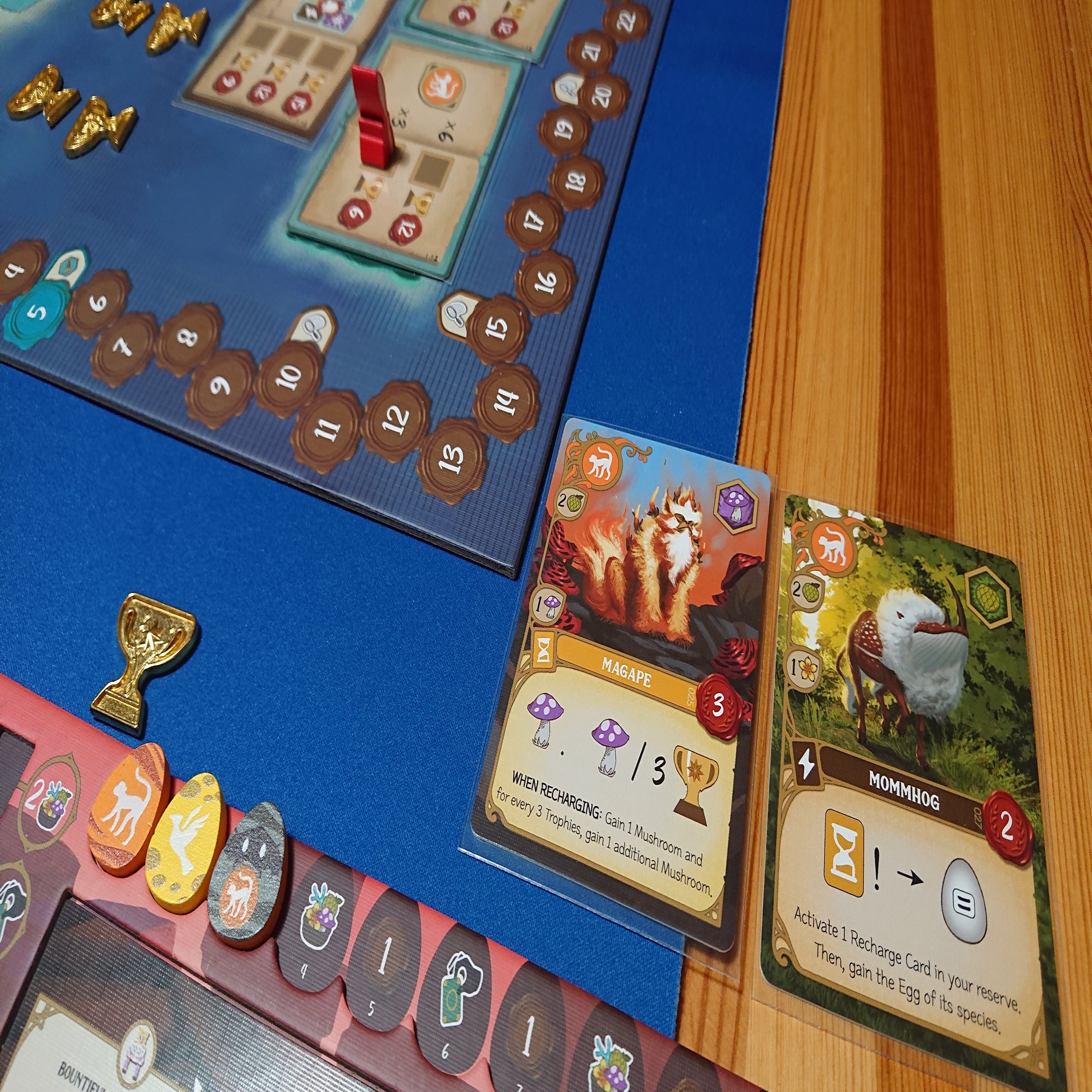 ゲームはワーカーを島の各地に配置して、その周囲にある資源やクリーチャーカードを獲得して、自分の場にプレイしていきます。さらにプレイしたカードの効果を適用して…みたいな感じで進んでいきます。最終的にはメインボードに置かれた共通の目標を達成して、トロフィーを集めることが目的になります。
