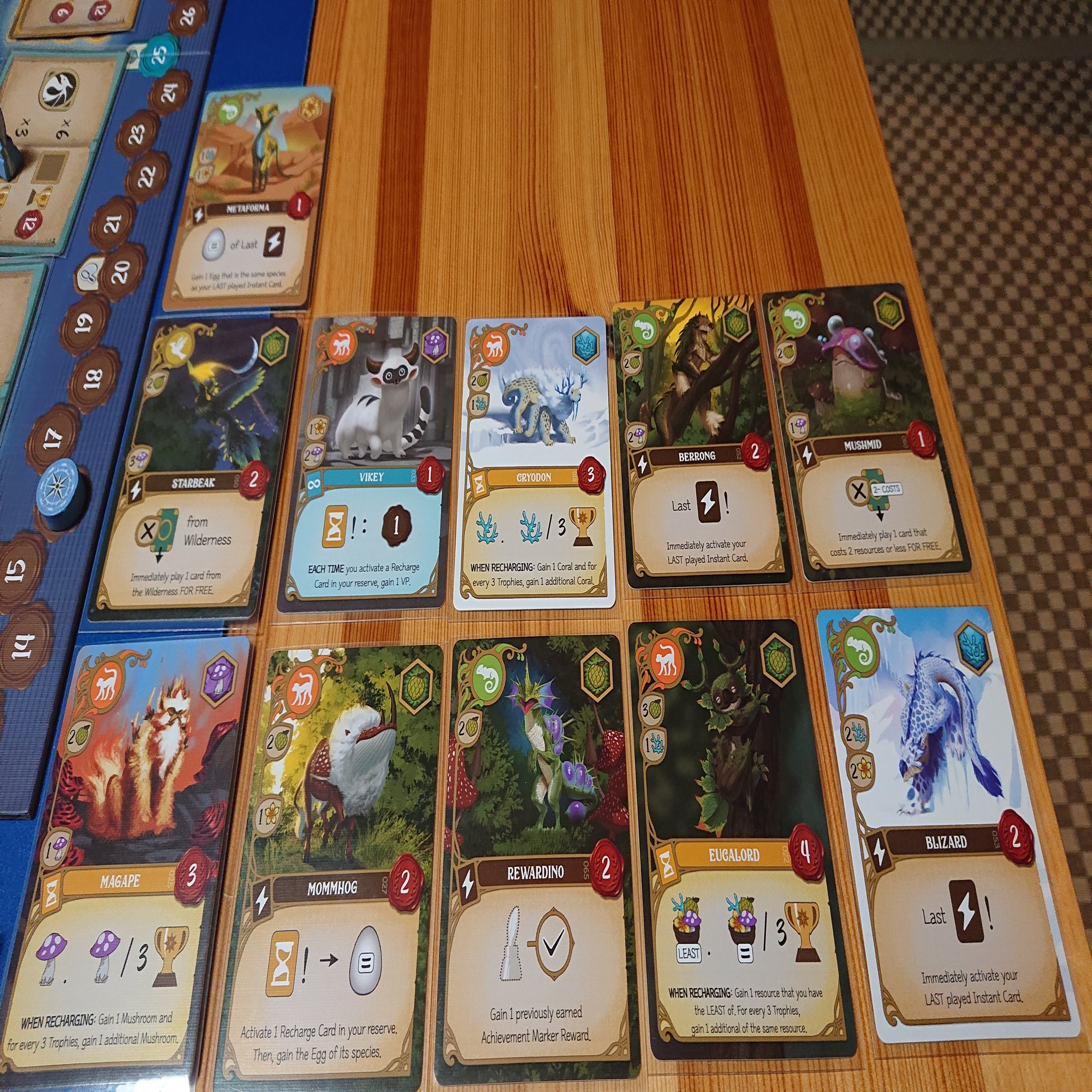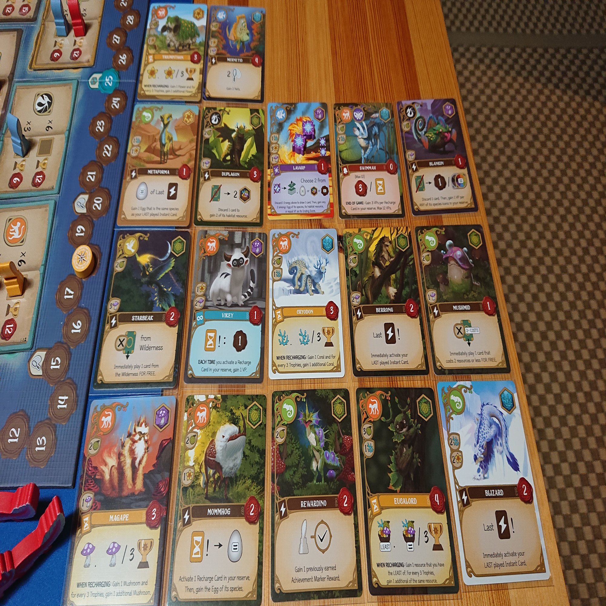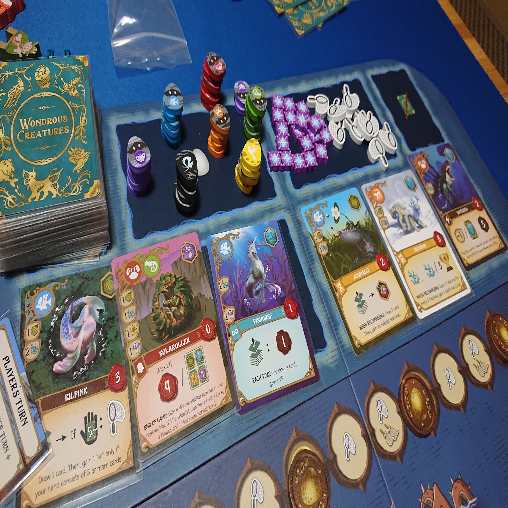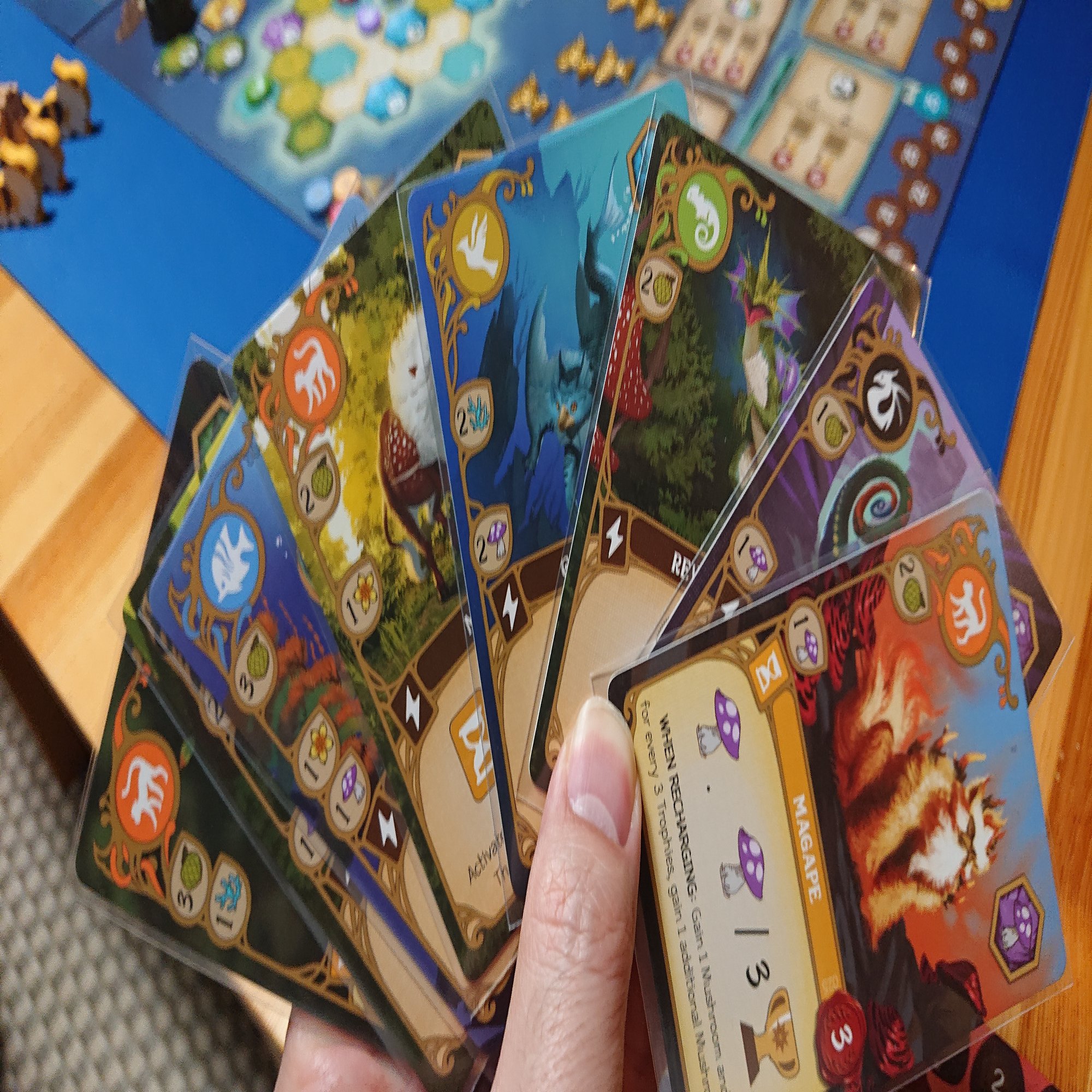 ゲームはワーカーを島の各地に配置して、その周囲にある資源やクリーチャーカードを獲得して、自分の場にプレイしていきます。さらにプレイしたカードの効果を適用して…みたいな感じで進んでいきます。最終的にはメインボードに置かれた共通の目標を達成して、トロフィーを集めることが目的になります。
