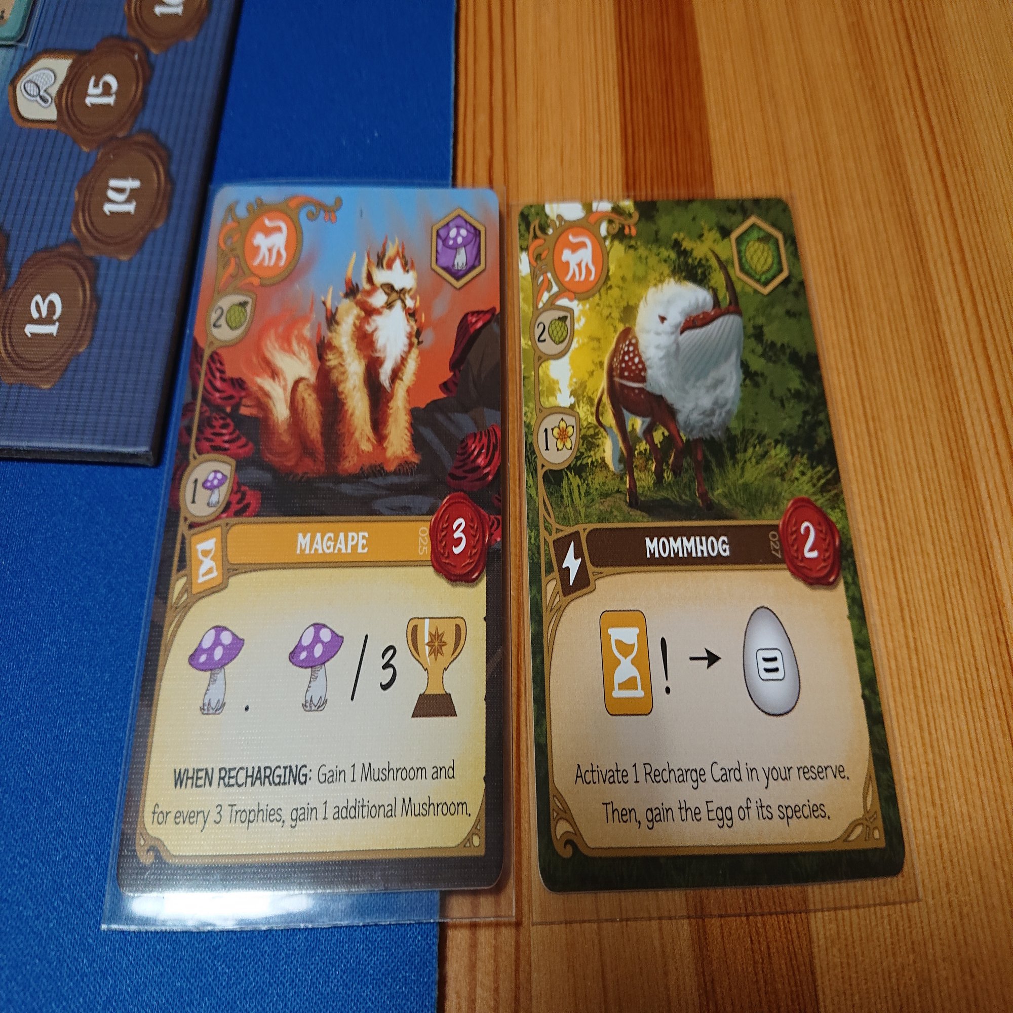 クリーチャーの能力は5種類あり、『即時効果』『リチャージ時効果』『永続効果』『フリーアクション』『ゲーム終了時得点』があります。このうち、フリーアクションはゲーム中に使える回数が決まっています。