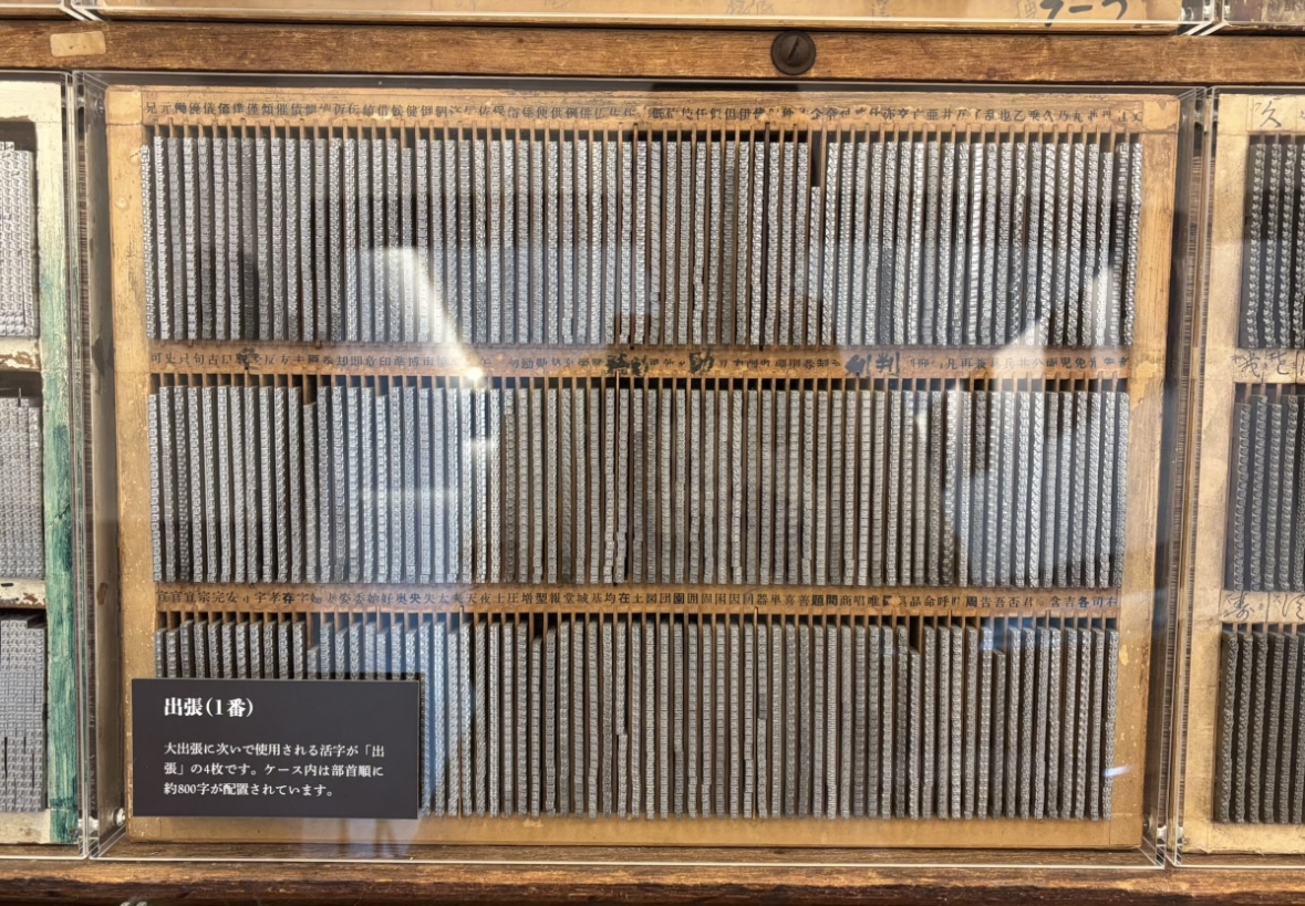 活字の棚には種類があり、よく使う文字から「大出張」「出張」「小出張」に分けられている。