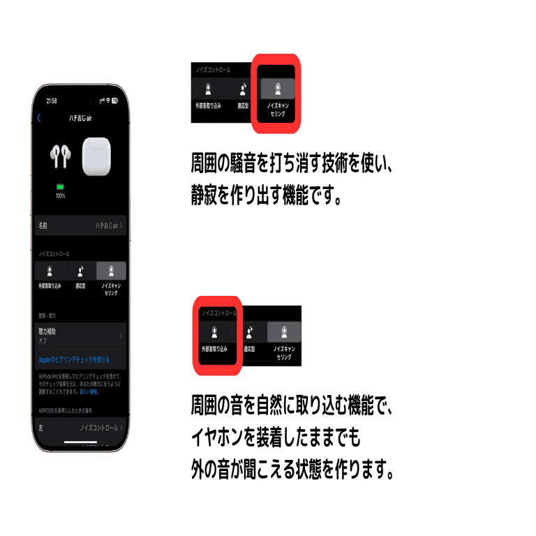 AirPods Pro 2では、「アクティブノイズキャンセリング」「外部音取り込み」「オフ」の3つのモードを切り替えられます。