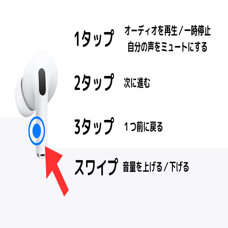 新しく追加されたタッチコントロール機能では、イヤホンのステム部分を上下にスワイプすることで音量調整ができます。