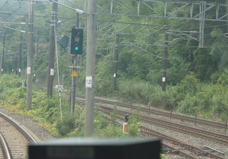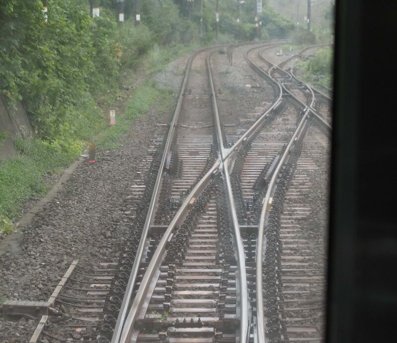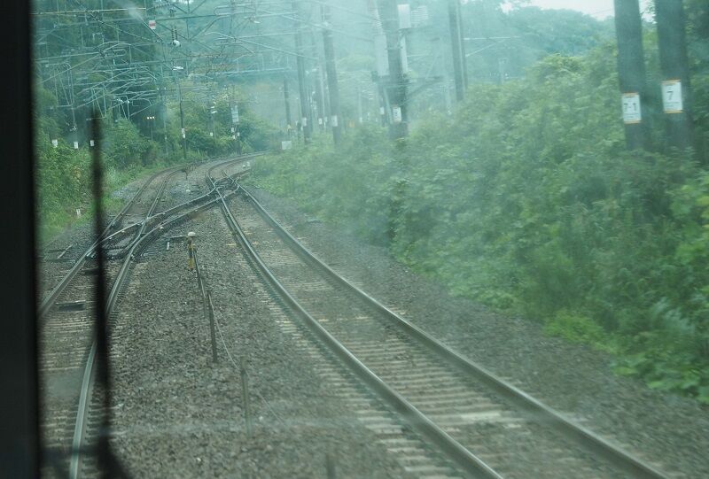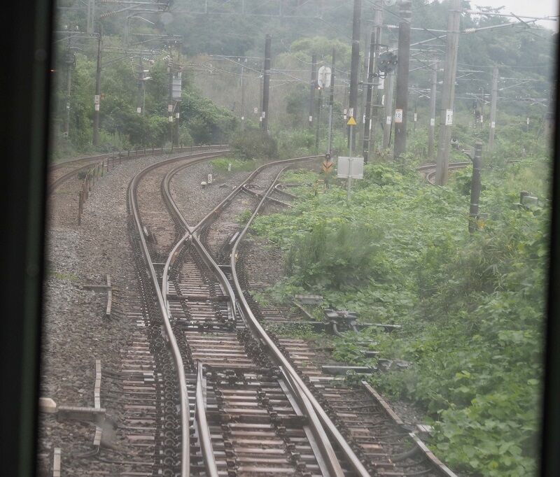 塩釜を過ぎたら先頭にかぶりつく。通勤時間帯なので立ち客も多く、その隙間からカメラを構えた。渡り線に接近。