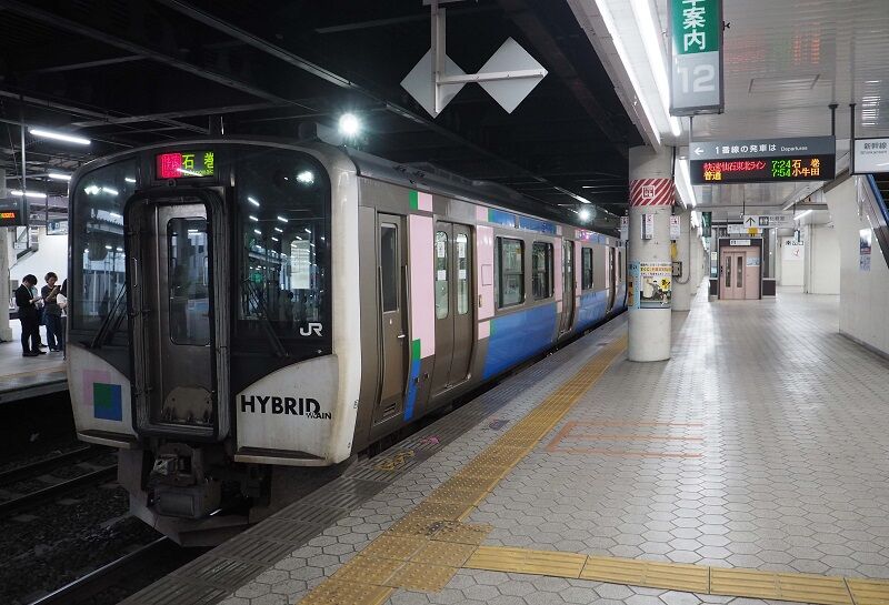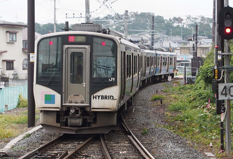 電気方式が異なる東北本線と仙石線を直通するため、HB-E210系が新製された。トイレ付きのHB-E211とトイレなしのHB-E212の2両でユニットを組む。HBというようにバッテリーを備えた電気式ディーゼルカーなのだが、座った位置が前寄りだったので走り出してもモーター音はほとんど聞こえなかった(連結面寄りの台車がモーター付き)。