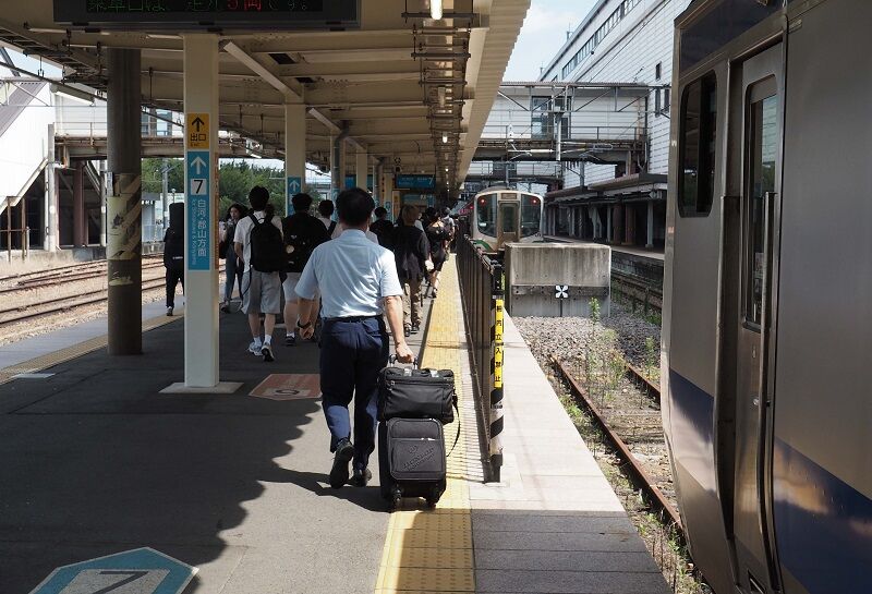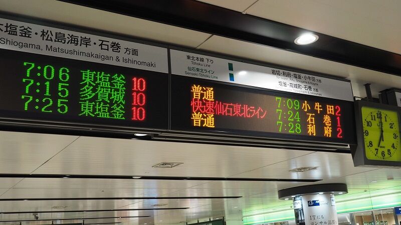 8:56、仙台到着。9:05発の白石行きに乗るため地上ホームに急ぐ。1本前の8:38着なら改札脇の立食いそばで腹ごしらえができたはずだが、ここは乗継ぎが優先。仙石東北ラインに乗る前に菓子パンを1個かじっておいたから、なんとか飢え死にはしないですむだろう。