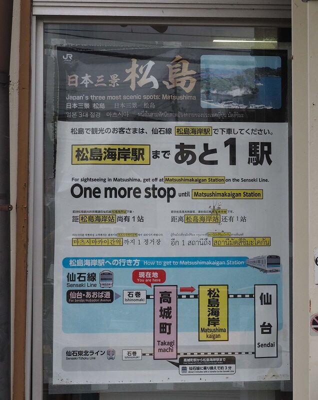 乗る列車は7:24発の快速石巻行き、仙石東北ラインとあるように東北本線経由で仙石線に入る。東北本線の塩釜~松島間、仙石線の松島海岸~高城町間は線路が接近している箇所があり、2015年、ここに連絡線を設けることで仙台から高城町以遠への所要時間短縮が可能になった。東北本線内は塩釜にしか止まらないので、仙台~高城町間は仙石線の45分程度に対して27分程度に短縮されている。