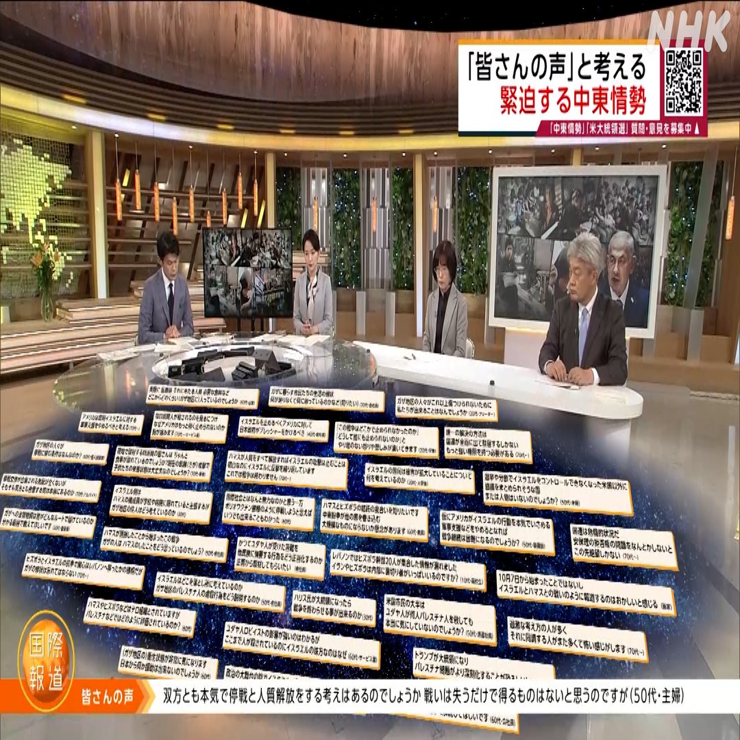 ご紹介した3つの声は中東情勢に関するものですが、「国際報道2024」では、ウクライナ情勢や、アメリカをはじめ世界で広がる「分断」など、混とんとする国際情勢をどのように見ていけばいいのか、皆さんの「声」をもとに深掘りする番組づくりを進めています。