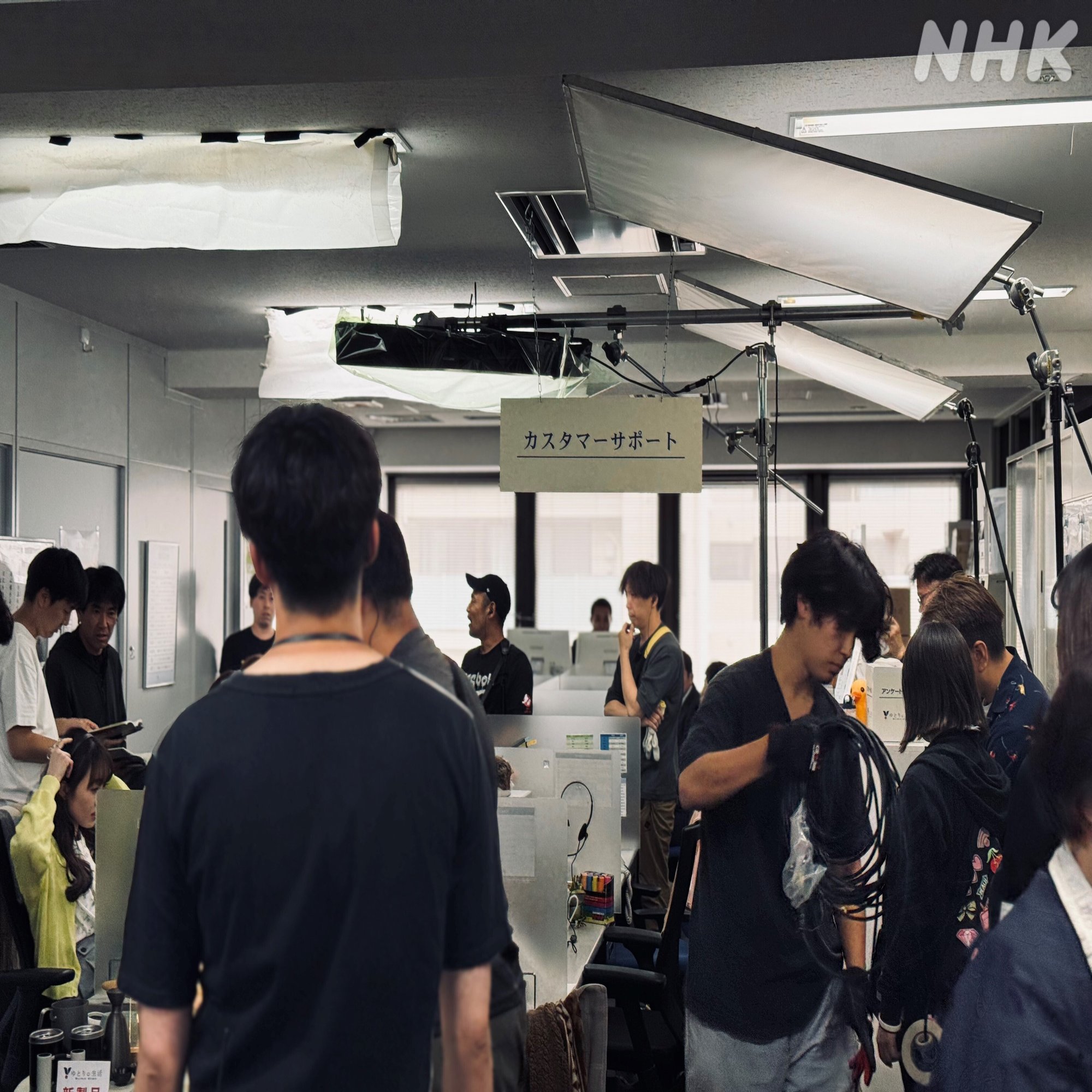 画像1の時は、俳優を映すというより、「ゆとりの生活」のオフィスの様子を表現しており、照明器具を置くところもないので、天井の照明の調整のみで雰囲気をつくっています。