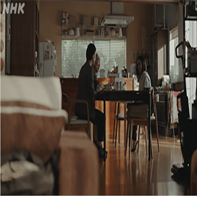 夫婦げんかのシーンなので手前の電気は消えている設定にして俳優はあえて影(シルエット)にして不穏な雰囲気にしています。