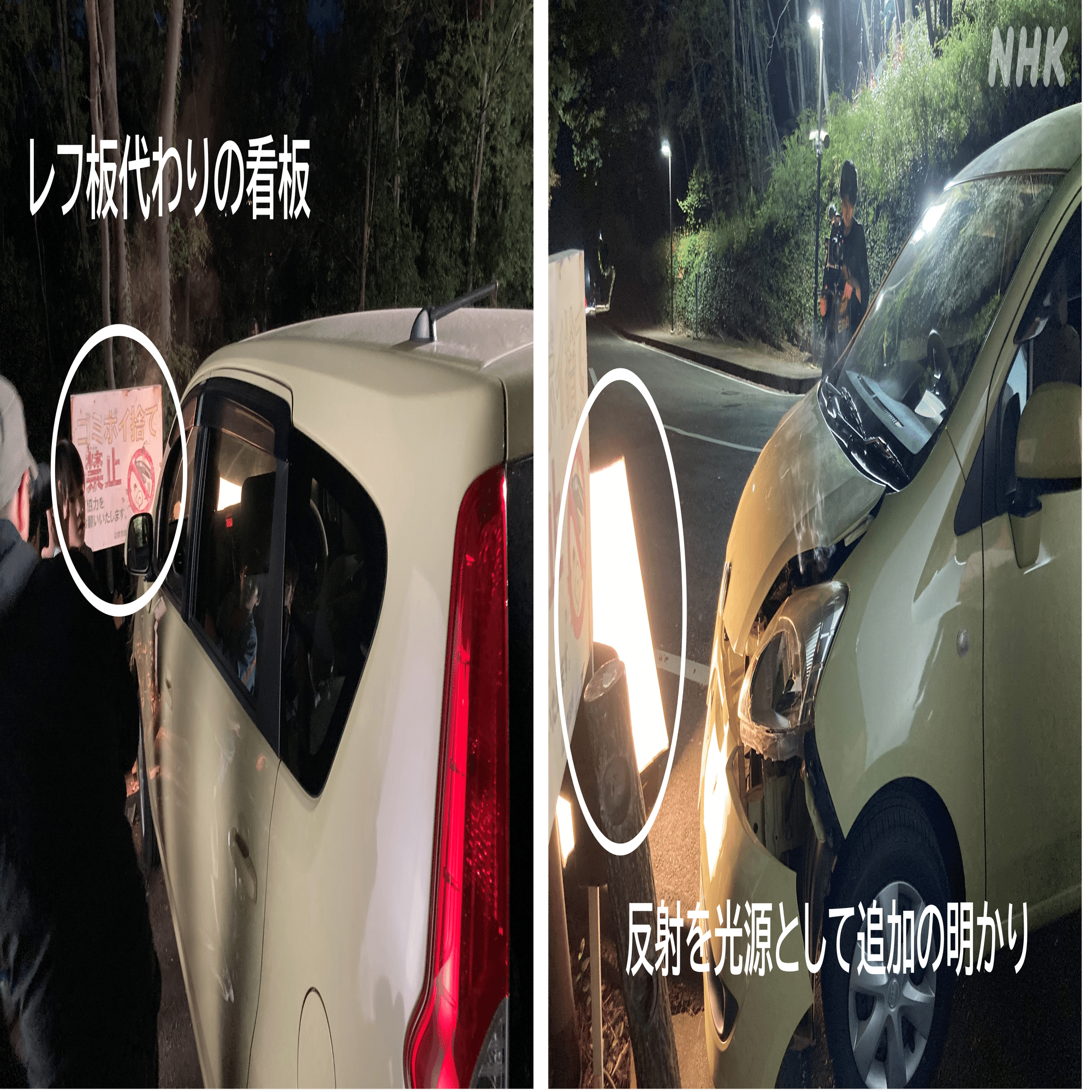 「車のヘッドライトを美術部で設置する看板に当て、看板をレフ板のように使い自然な反射で照らす!」