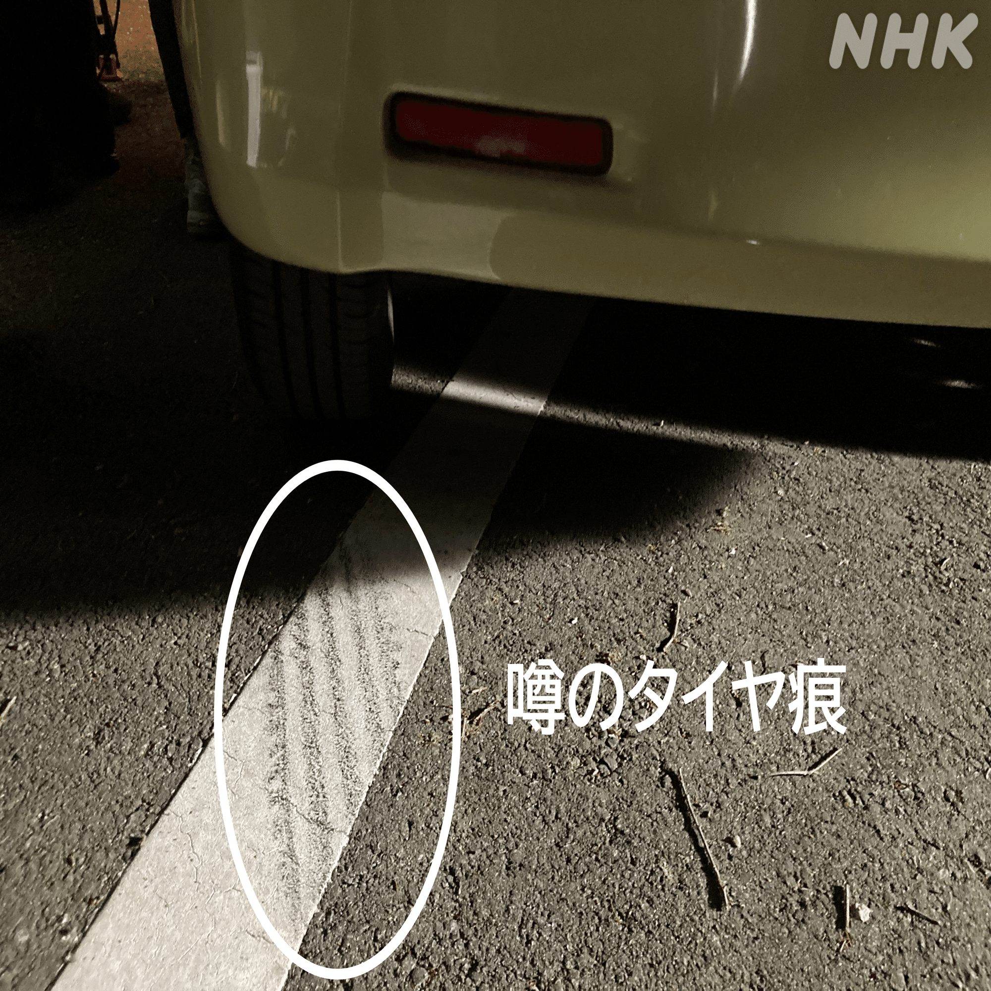 もうひとつ、事故現場のシーンで知恵と工夫で成立させたのが、道路についているタイヤ痕です!
