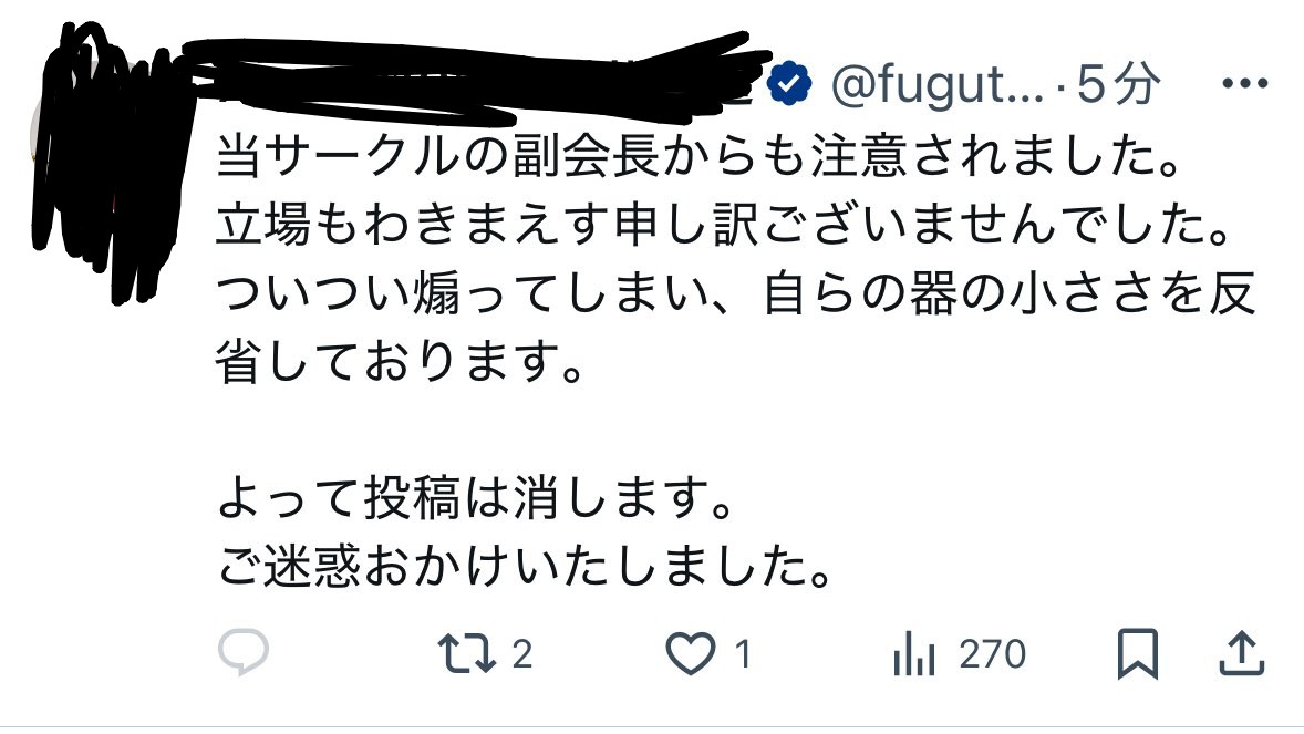 散々指摘があっただろうに副会長から言われたらツイ消しはダサすぎるっス
