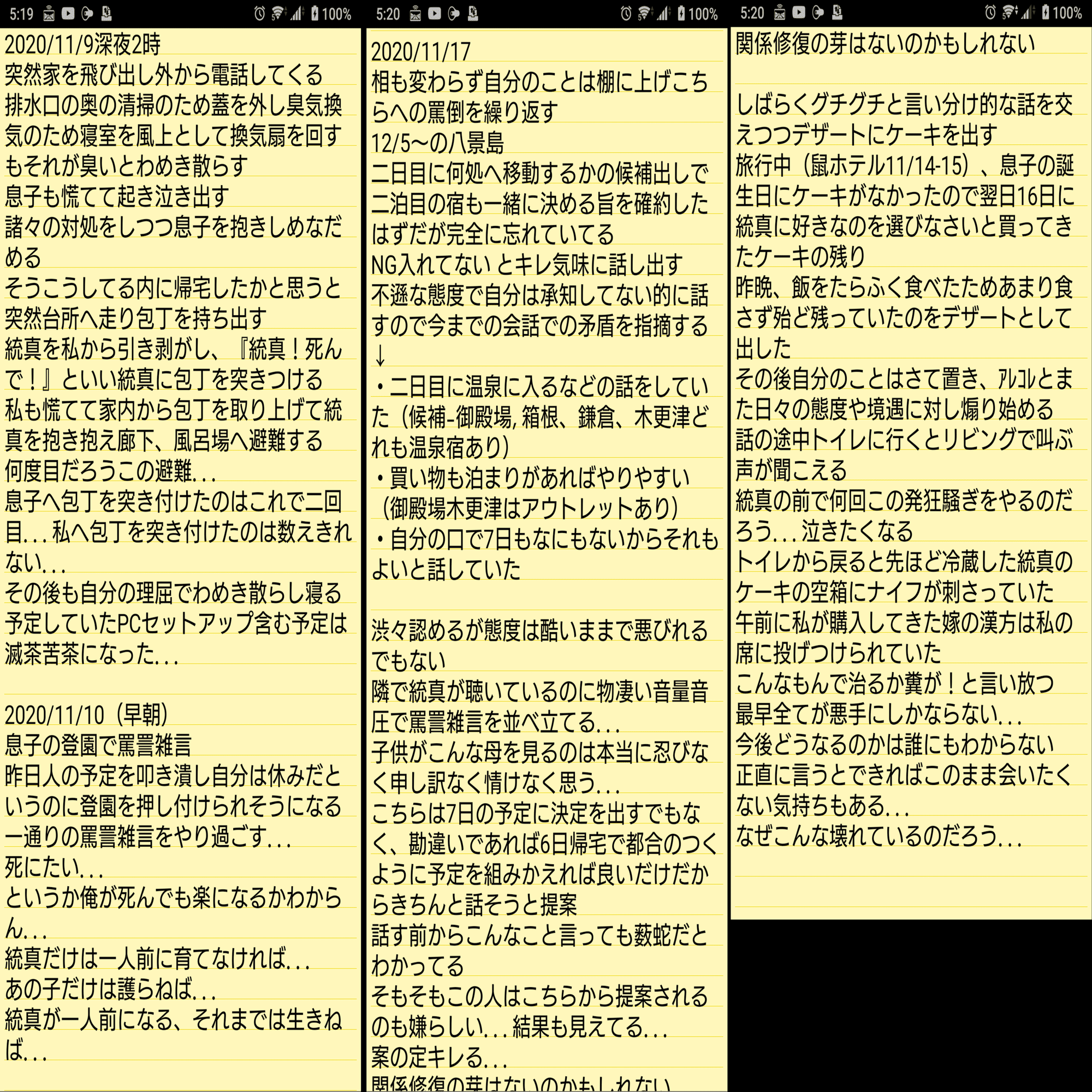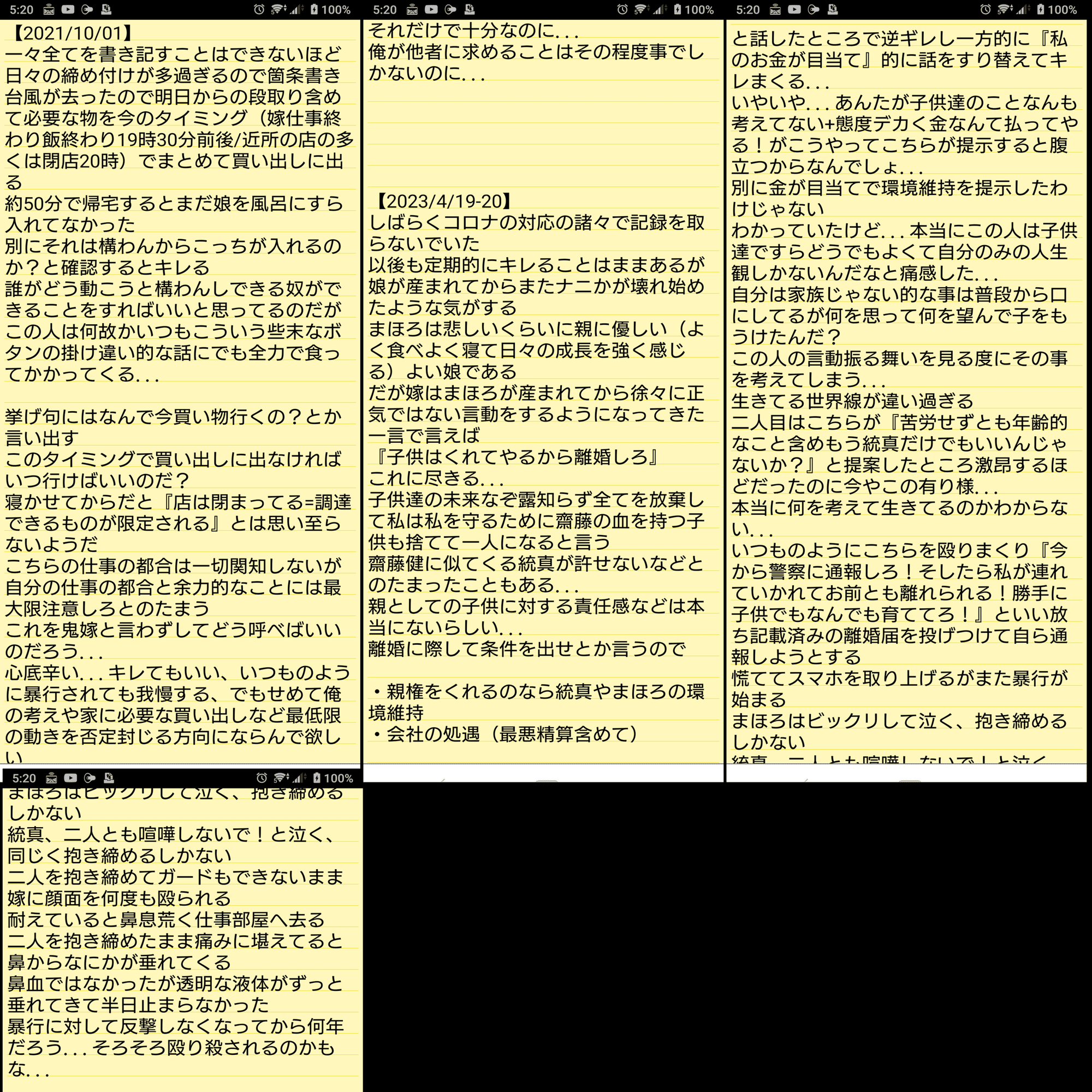 ただ子達は幼いながらも必死で止めたいがため自身の意思で割って入り受けた被害。母から苛烈に怒られ攻められることはあってもそれらを虐待的に認識できてはいなかったと思います。ですがその中の多くを私は証拠記録保存にも努めていました。いずれ妻を諭す時も来るだろう…その時の客観的証拠としても必要だとの観点でした。
