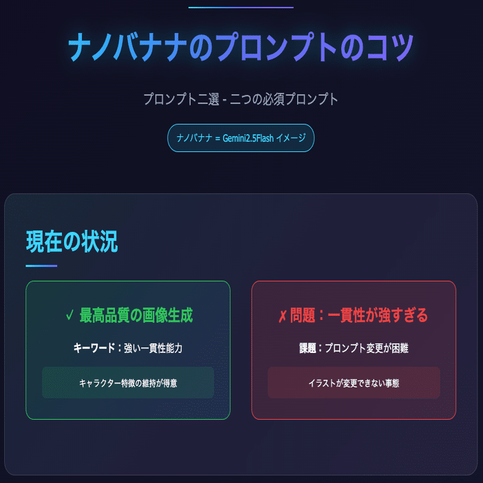 Googleの最新画像生成AI「Gemini2.5Flash image」(通称:ナノバナナ)は、確かに驚くほど高品質な画像を無料で生成してくれます。しかし、その優秀さゆえに「一貫性が強すぎて、変化させたい部分が変わらない」という、これまでにない問題が浮上しました。