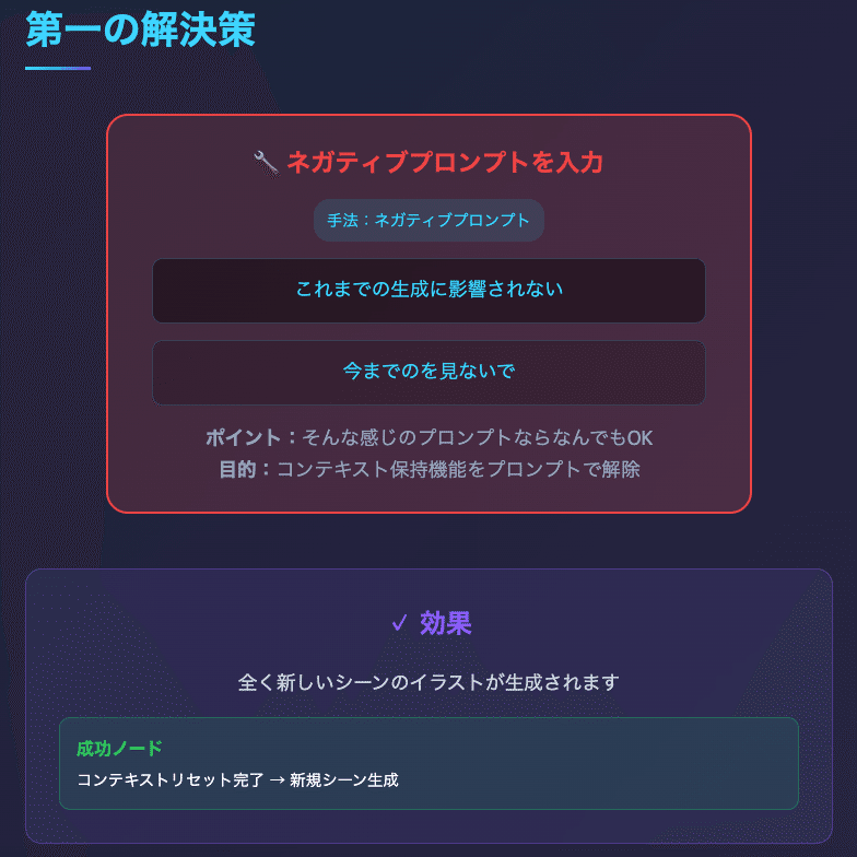 重要なのは、この技術がGemini2.5Flashに限定されないことです。ネガティブプロンプトとプロンプトチェーンは、プロンプトエンジニアリングの基本原理であり、文章生成AIでも同様の効果を発揮します。