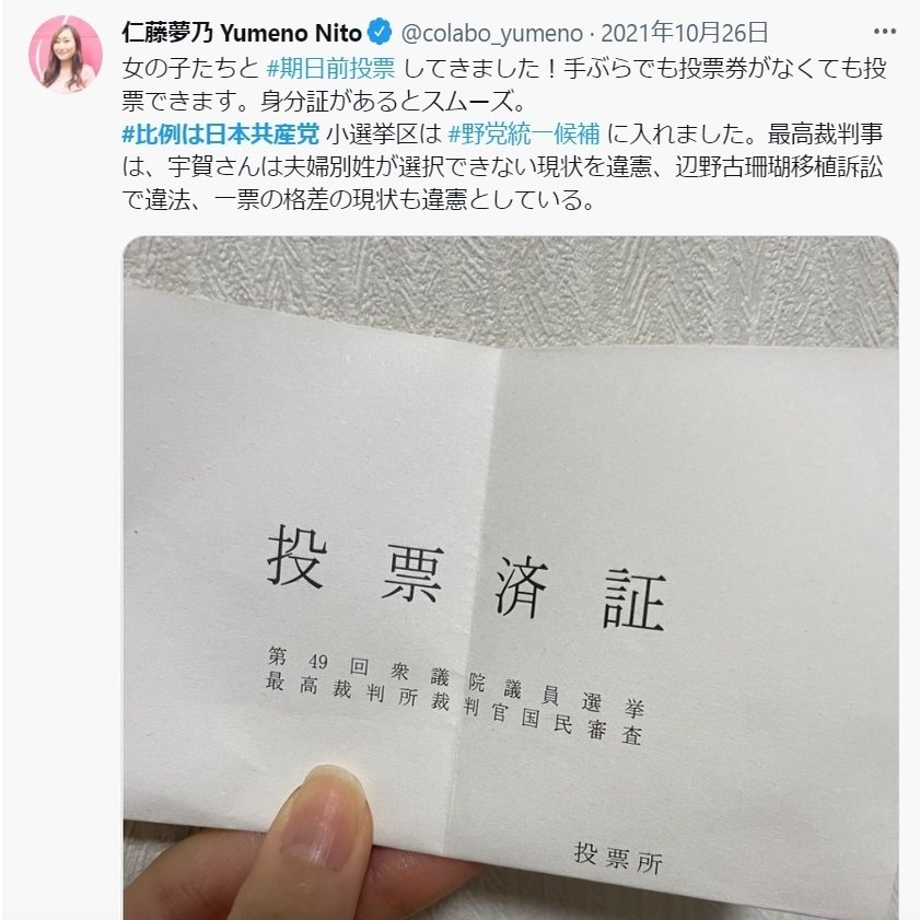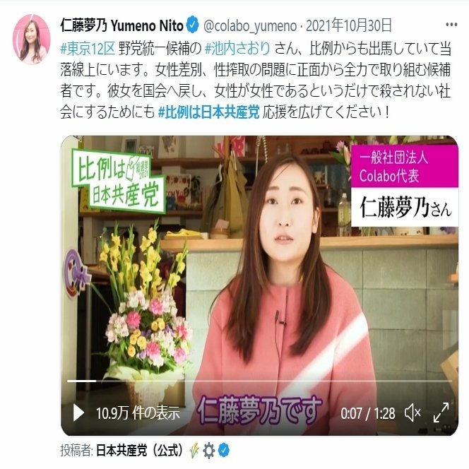 空「Colabo代表として共産党の公式Youtubeに出演して応援し、共産党候補の動画を事務所内で上映してスタッフにも見せ、公式ツイッターで日々共産党支持を訴えかけ、さらに女の子たちを連れ立って期日前投票に行き共産党に投票したと宣言する。これで政治活動じゃなかったらなんなんだって話だね」