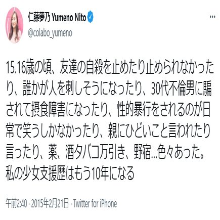 空「たとえば共産党と強いつながりがあるColabo代表仁藤夢乃さんはツイートでは30代の不倫男に騙されたことがあるって話をツイートしてるんだけど、難民高校生にはその話は出てこないんだ」