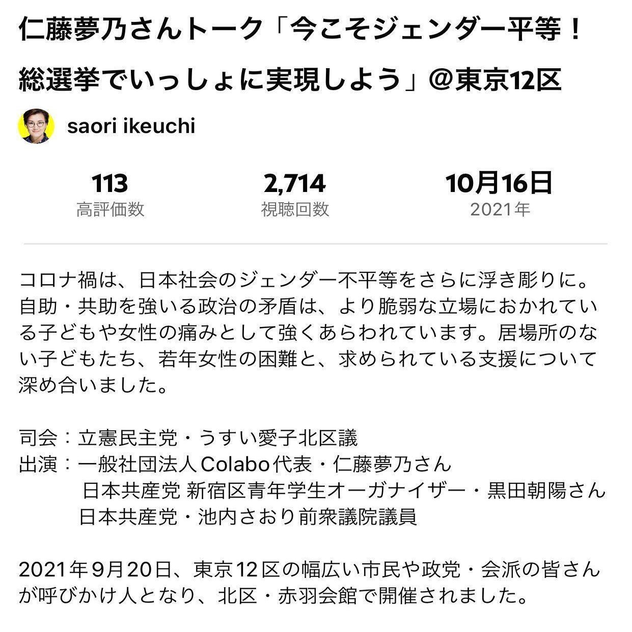 空「なんならこっちの共産党池内さおりさんとのColaboとして児童問題をトークしたイベントだと、最後のコメントで”池内さんをまず国会に戻すこと。ぜひみなさんも知り合いにも呼びかけ次の選挙で票を入れてもらえるようにがんばってもらいたい”って言ってるからね」