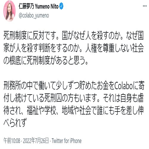 空「独居房とお金の話で思い出したけどさ、共産党と強いつながりがあるColabo代表仁藤夢乃さんの信奉者には死刑囚もいて、死刑囚なのに寄付してくれる人がいるから共産党と強いつながりがあるColabo代表仁藤夢乃さんは死刑に反対らしいんだよね」