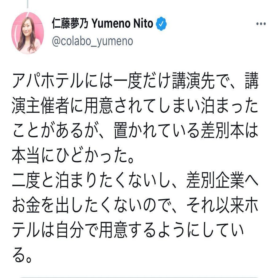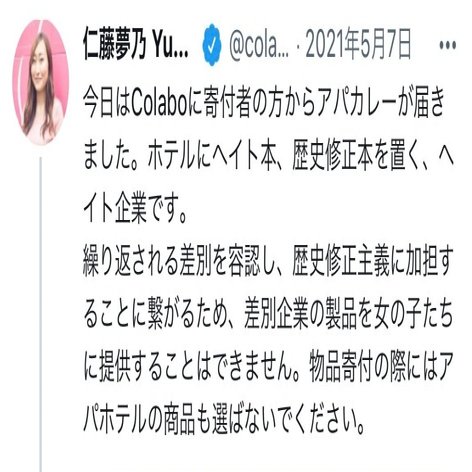 な「アパホテルハラスメントですよ!!!共産党と強いつながりがあるColabo代表仁藤夢乃さんは女の子のために送られてきた寄付物資であってもアパカレーは絶対に許さない思想の持ち主です!!アパホテルを宿泊先に用意したら一生恨まれるんですよ!!!」