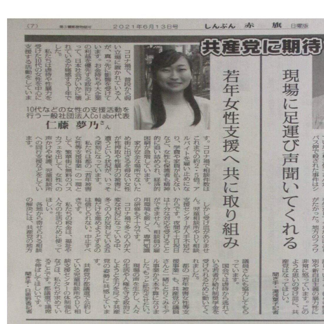 空「まあ共産党と強いつながりがあるColabo代表仁藤夢乃さんは新聞あかはたにもバッチリ登場してるから、刑務所であかはたを読んで一方的に知り、寄付金を送ってきたのかもしれないね」