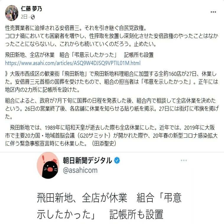 共産党と強いつながりがあるColabo代表仁藤夢乃さんの安倍元総理誹謗中傷について