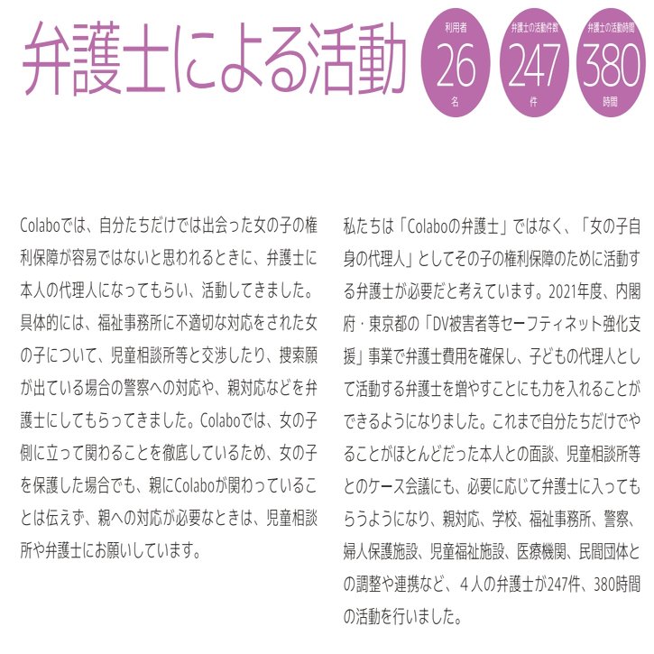 空「更に奇妙なことに、2021年の活動報告書別ページには弁護士の活動は利用者は26名、247件、となってるんだ。利用者が26名ってことは弁護士の対応は、面談などの述べ回数だよね。」