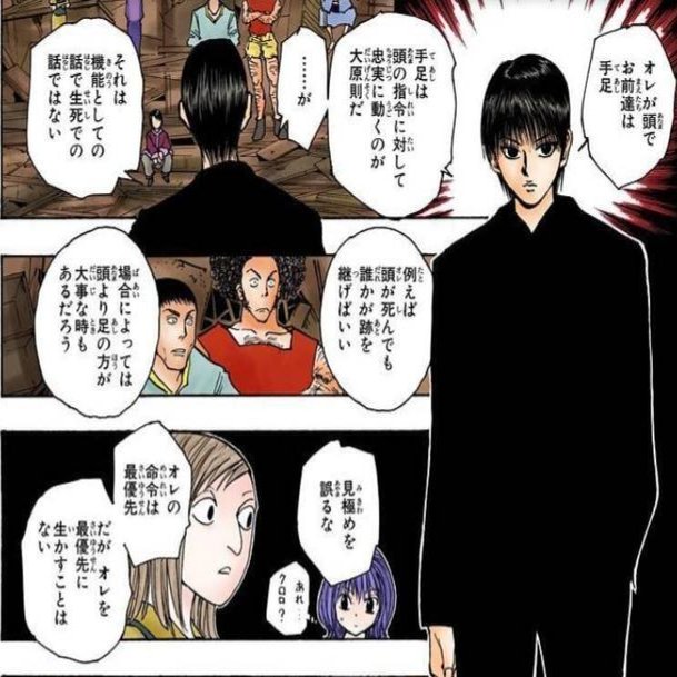 クロロは自分の仲間たちが8人で、自分をリーダーだと仰ぐことに気恥ずかしさを覚えていた。まるで8本足の蜘蛛だと。また、きちんとルールを設けた組織にしないと、いつか壊滅するだろうとも思った。だから幻影旅団を作った。