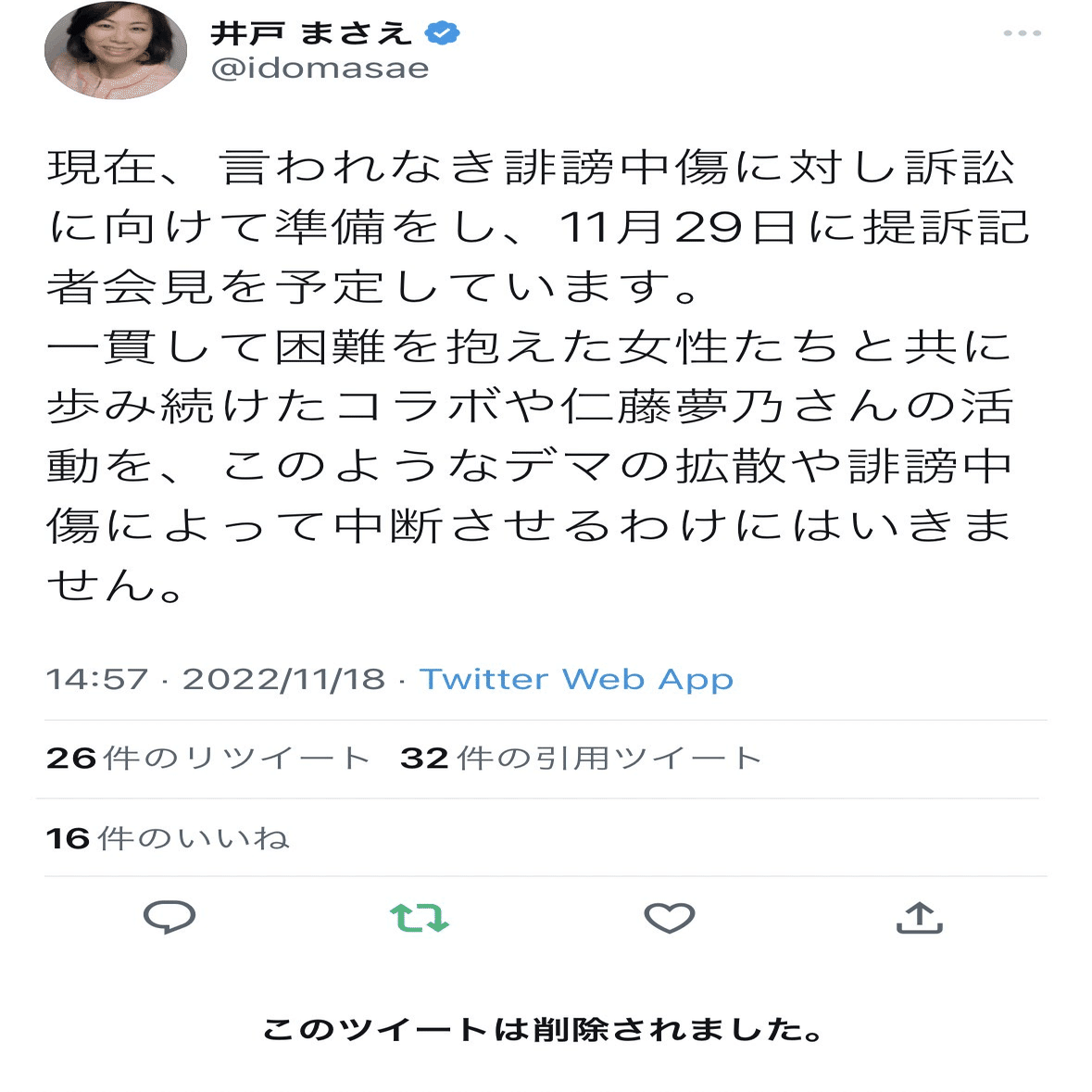 そうした場合、井戸まさえさんに「おいその件に首を突っ込むな」と偉い人レベルからストッピがかかり、削除したと考えられる。