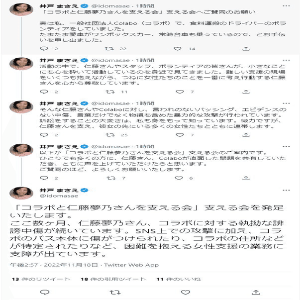 みたいなお願いだけを覚えていたのではないか。そしてその後共産党と強いつながりがあるColabo代表仁藤夢乃さんは色々とあってツイートもほとんどしなくなってしまった。井戸まさえさんにいちいち連絡して情報をアップデートもしていなかった。