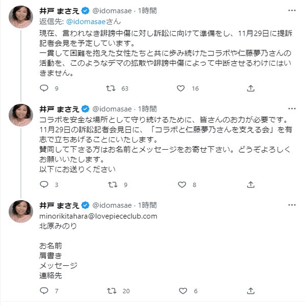 以上の経緯だと仮定した場合、井戸まさえさんが「そろそろ提訴の時期のはずね!」と勇み足で告知をしたのを見た、この同意がとれていたであろう①共産党と強いつながりがあるColabo代表仁藤夢乃さん本人②草津温泉町長誹謗中傷事件で問題となっている北原みのりさんのどちらかが、オイオイオイオイチョットマテヨ!と止めに来たと考えられる。