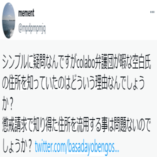 また、弁護団とColaboにも問います。僕の個人情報をどういった合法的な手段で得ましたか?その合法的な手段を説明していただけますか?発信者開示請求以外の方法で、どうやって僕の個人情報を得たのですか?