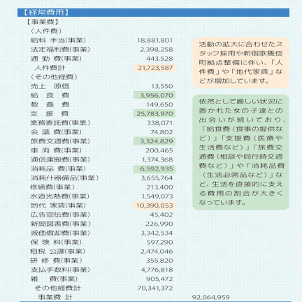 ひ「ちなみに面倒だから省略するけど、令和2年度以前においても、車両関連費用、配布物広報物購入制作費、会議費、法定福利費において若年被害女性支援事業の経費がColabo活動報告書の全体会計よりも大きくなるから全部不正だよ。たとえばこれ令和2年ね、会議費とか車両費とか印刷費みて、活動報告書のほうが小さい。マジで詰んでる」