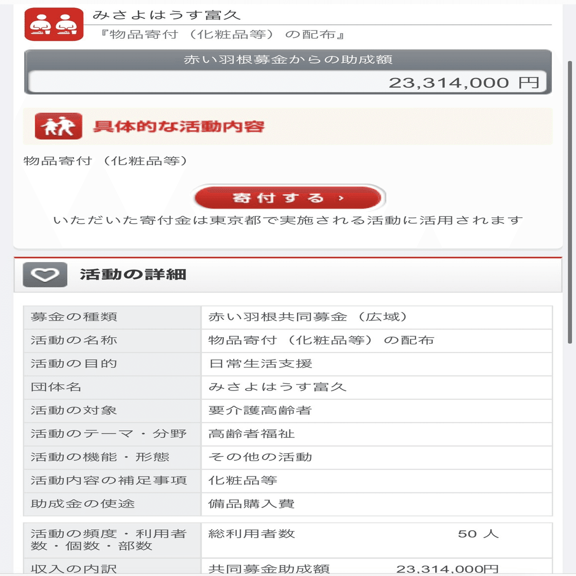 ひ「辻元清美さんと蓮舫さんは立憲の中でも特にナニカグループに強く繋がりがある人達だね。他には今回のWBPCとは関係ないけど化粧品等配布で50人対象(なのに施設定員44名)に2330万とか凄いのもあったから、アカい羽根募金はもうむちゃくちゃだと思うよ」