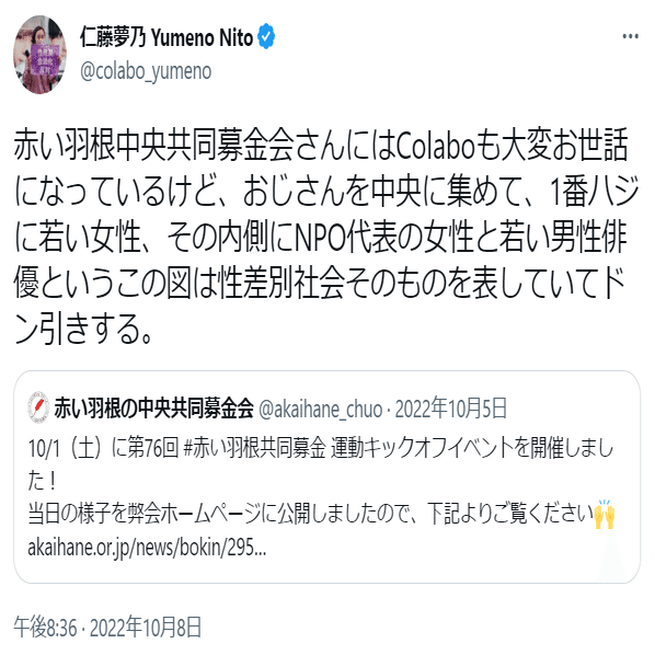 ひ「まあ完全にやられてるね。アカい羽根募金はナニカグループの貯金箱だよ。村木厚子さんが一声かければナニカグループにアカい羽根募金から金が出るってわけ。それは共産党と強いつながりがあるColabo代表仁藤夢乃さんのこのツイートみてもわかるよ」