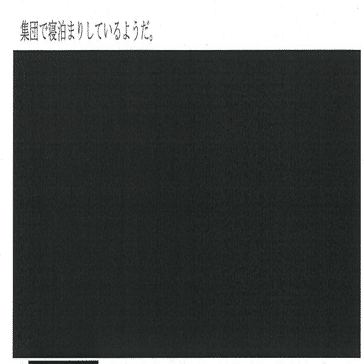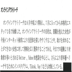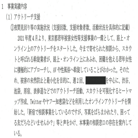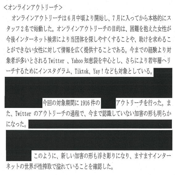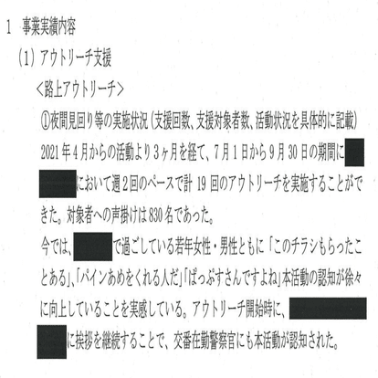 な「はい、えーと当団体のアウトリーチスタッフは全員女性スタッフであり、■■■■■■■■■■で生活をしていた当事者・福祉系の大学生も含まれていることから、スタッフの安心と安全をどのように担保してアウトリーチを続けていけばよいか模索中であった。11月末には、アウトリーチで知り合った男性が殺害された事件も発生した・・・・・・・・えっ?」