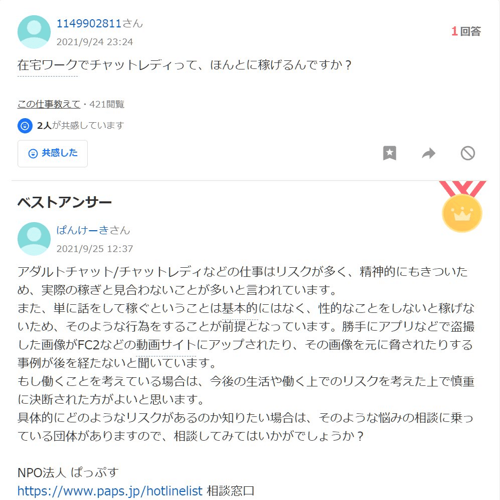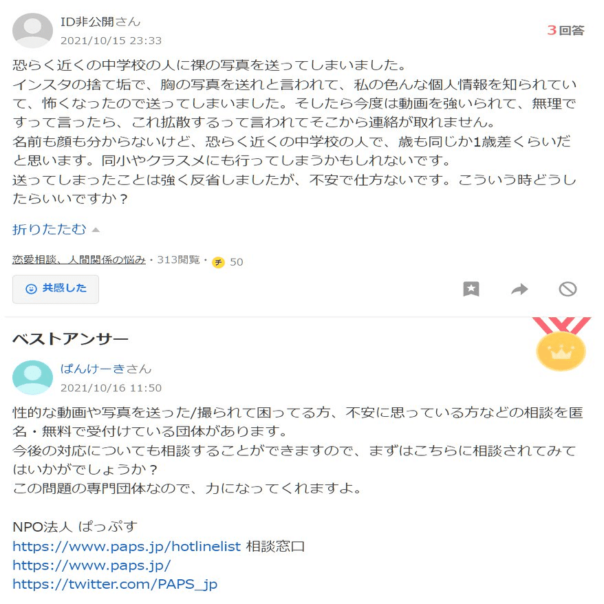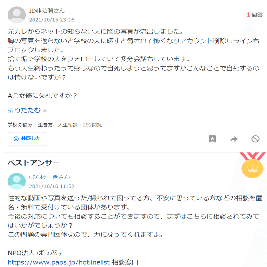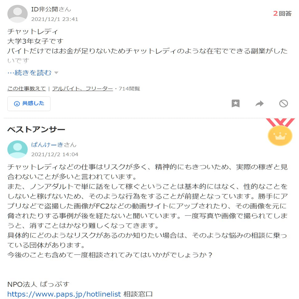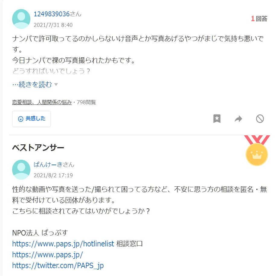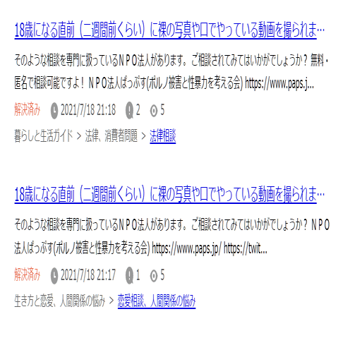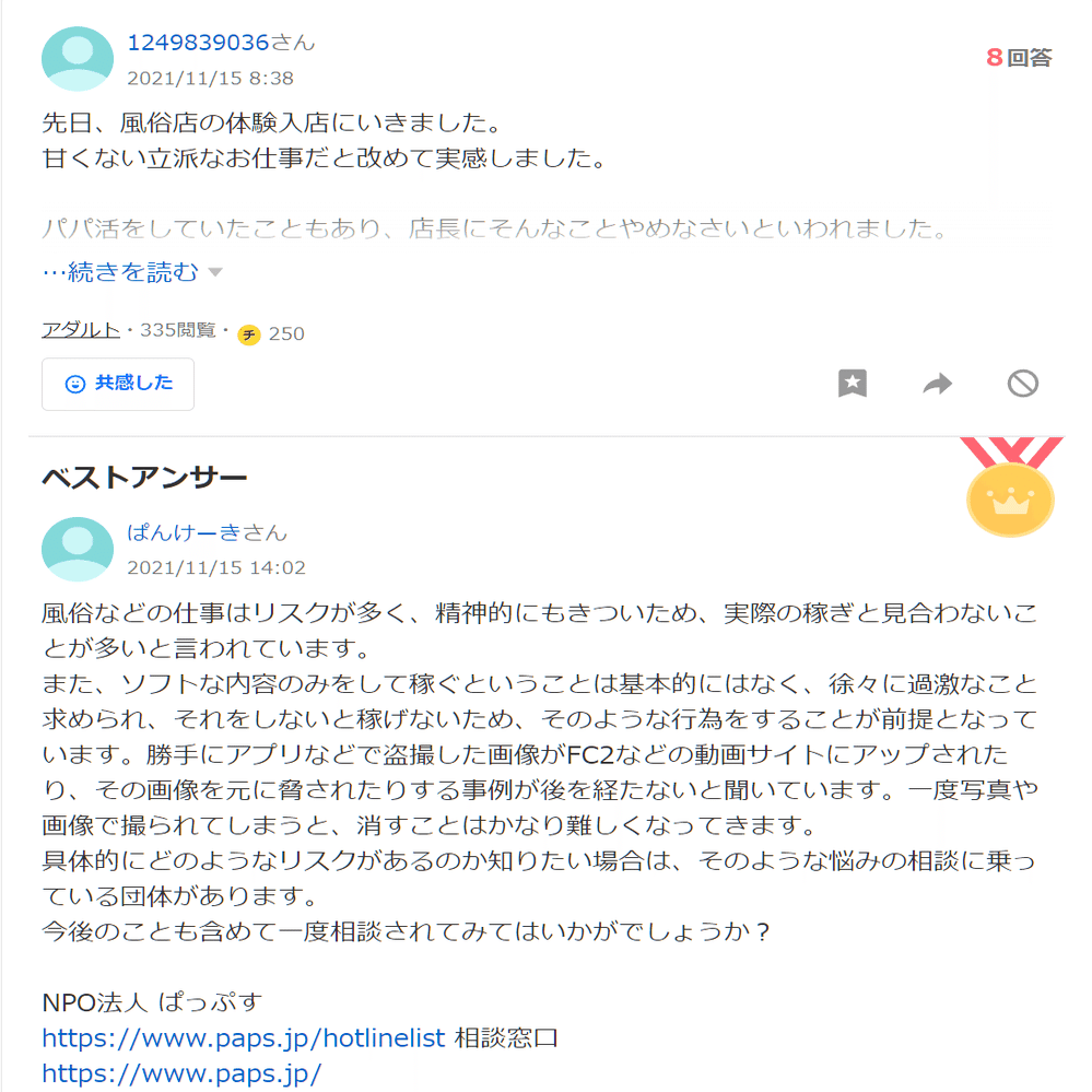 ひ「あとこの質問者ね、ぱっぷすが若年被害女性等支援事業に参加した2021年5月に登録して、そこから今日までの1年と8ヶ月で1057件も質問してるよ」