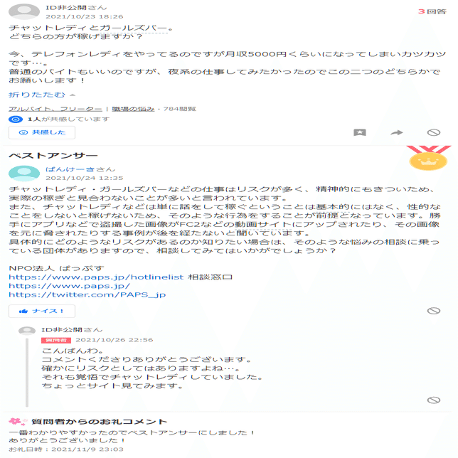 Q「なるほど!私は今チャットレディをしてましたがサイト見てみます!一番わかりやすかったのでベストアンサーにします!!ぱっぷすさんありがとう」