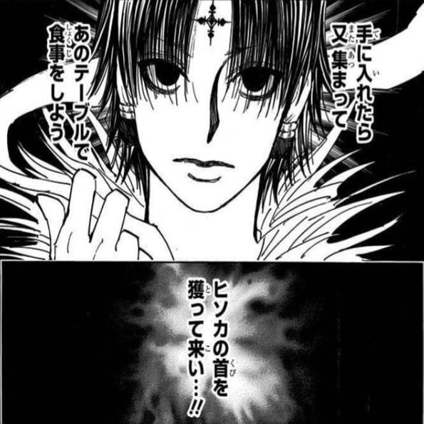 クロロは幻影旅団のリーダーに「望んでではなくなり、決まったことだから頑張っている」という。クロロにとって最優先事項はクモの存続で、ヒソカとの対決はおそらくサシだと負けると思ったのだろう。だから、サシで闘うという約束を破り、集団でヒソカを始末しようとした。幻影旅団の維持のために。