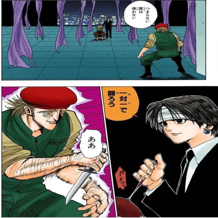 バンダナを外してヒソカを共闘でハメたのも、旅団の頭としての判断であり、バンダナクロロ(バトル好き)ならヒソカと本当にタイマンをしてあげたかもしれない。