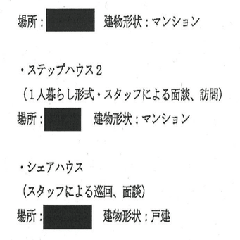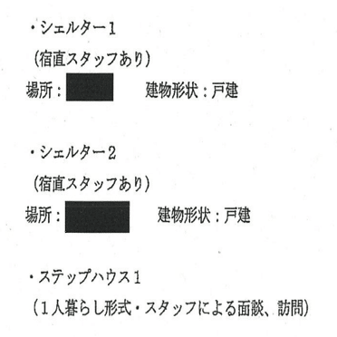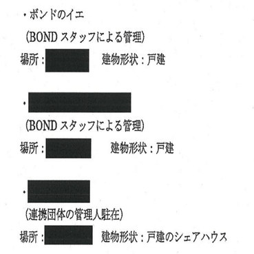 戸建てシェルター2つ、ステップハウス(1人暮らし)2つ、戸建てシェアハウスで5軒だね。そして家賃が上から順に月額で
